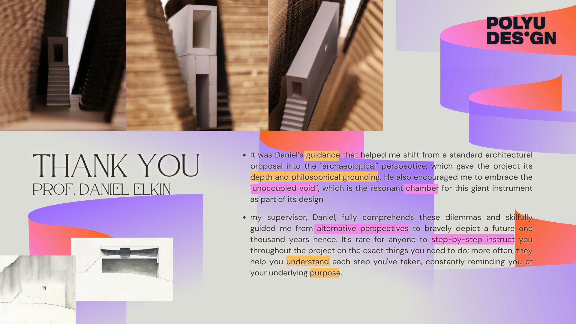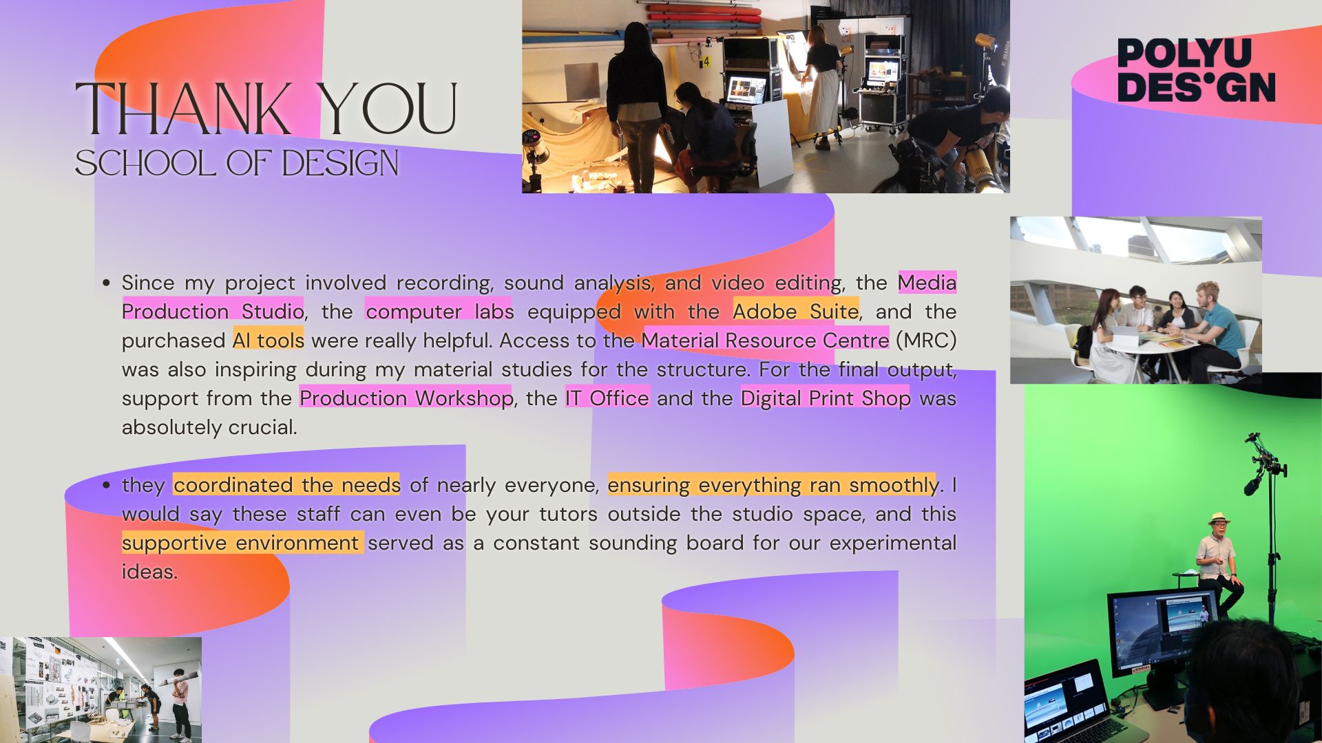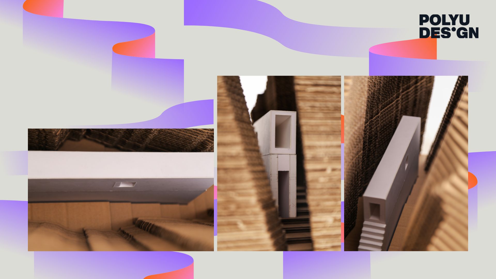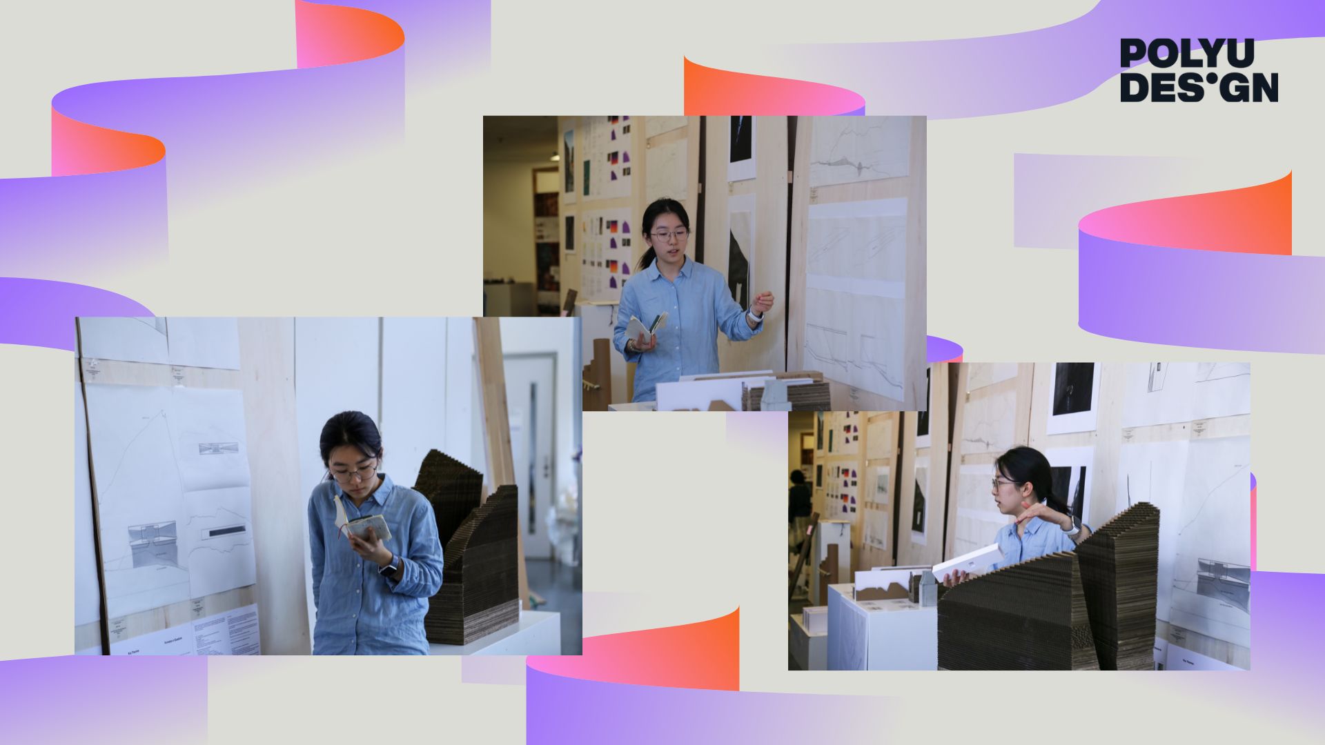 Coco showed immense resourcefulness by navigating the "ecosystem of resources" provided by PolyU. She utilized the Media Production Studio for sound, the Materials Research Centre for structural studies, and the Digital Print Shop for specialized binding. Additionally, she adapted her design to a **new narrative context**—moving from a standard architectural proposal to an "archaeological perspective" set one thousand years in the future. This allowed her to bypass the lack of significance in building a replica and instead create a "weaving fragment of history."