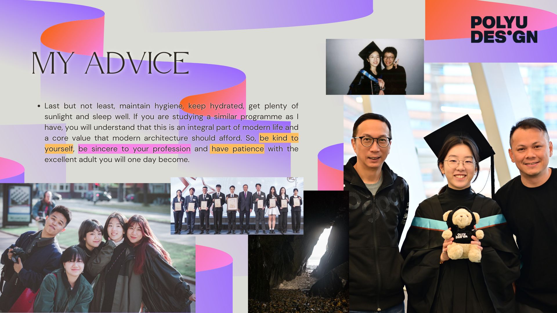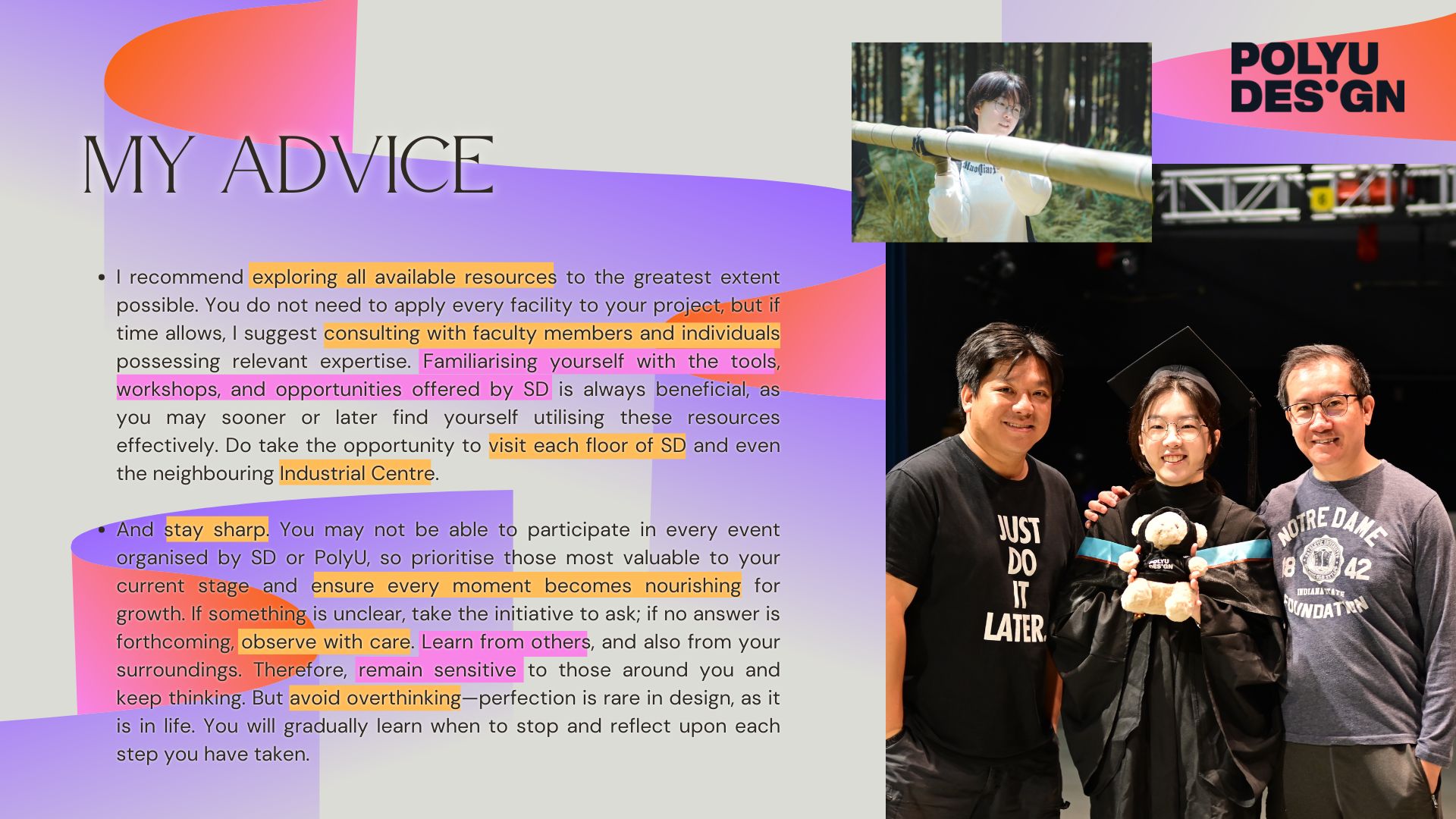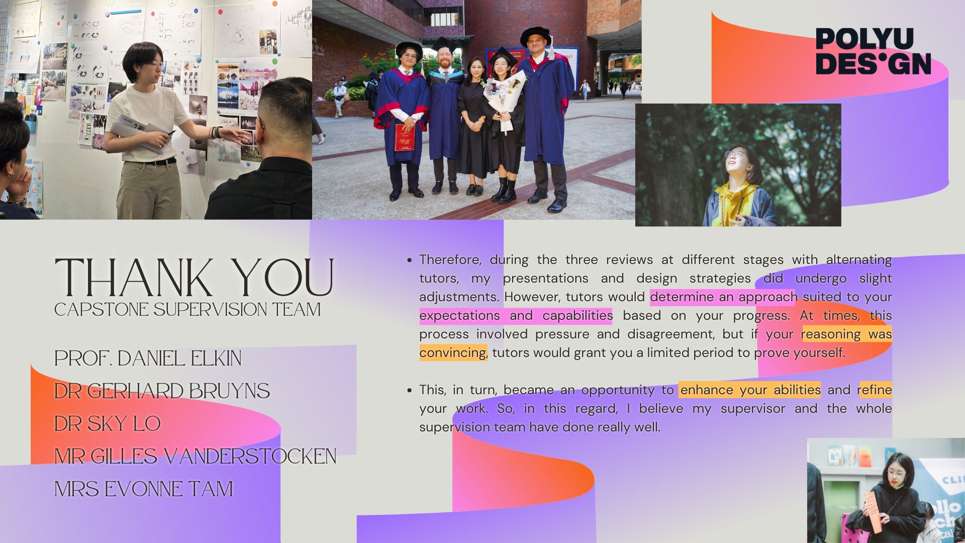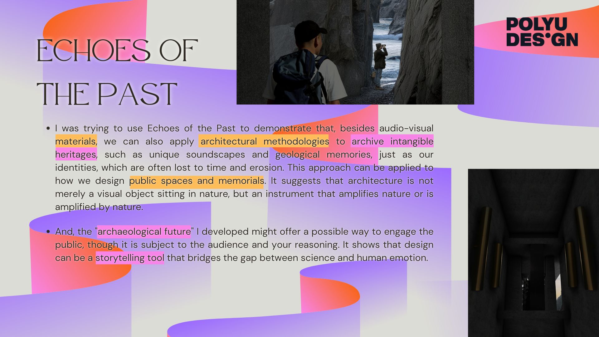 Coco showed immense resourcefulness by navigating the "ecosystem of resources" provided by PolyU. She utilized the Media Production Studio for sound, the Materials Research Centre for structural studies, and the Digital Print Shop for specialized binding. Additionally, she adapted her design to a **new narrative context**—moving from a standard architectural proposal to an "archaeological perspective" set one thousand years in the future. This allowed her to bypass the lack of significance in building a replica and instead create a "weaving fragment of history."
