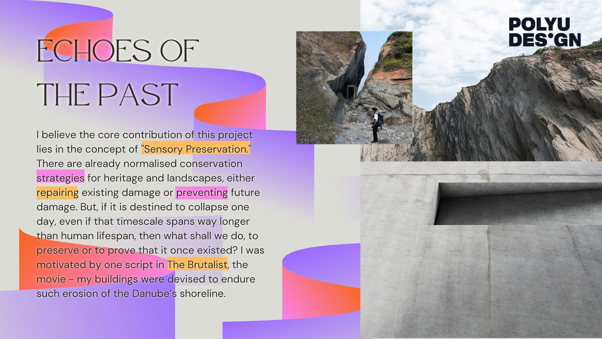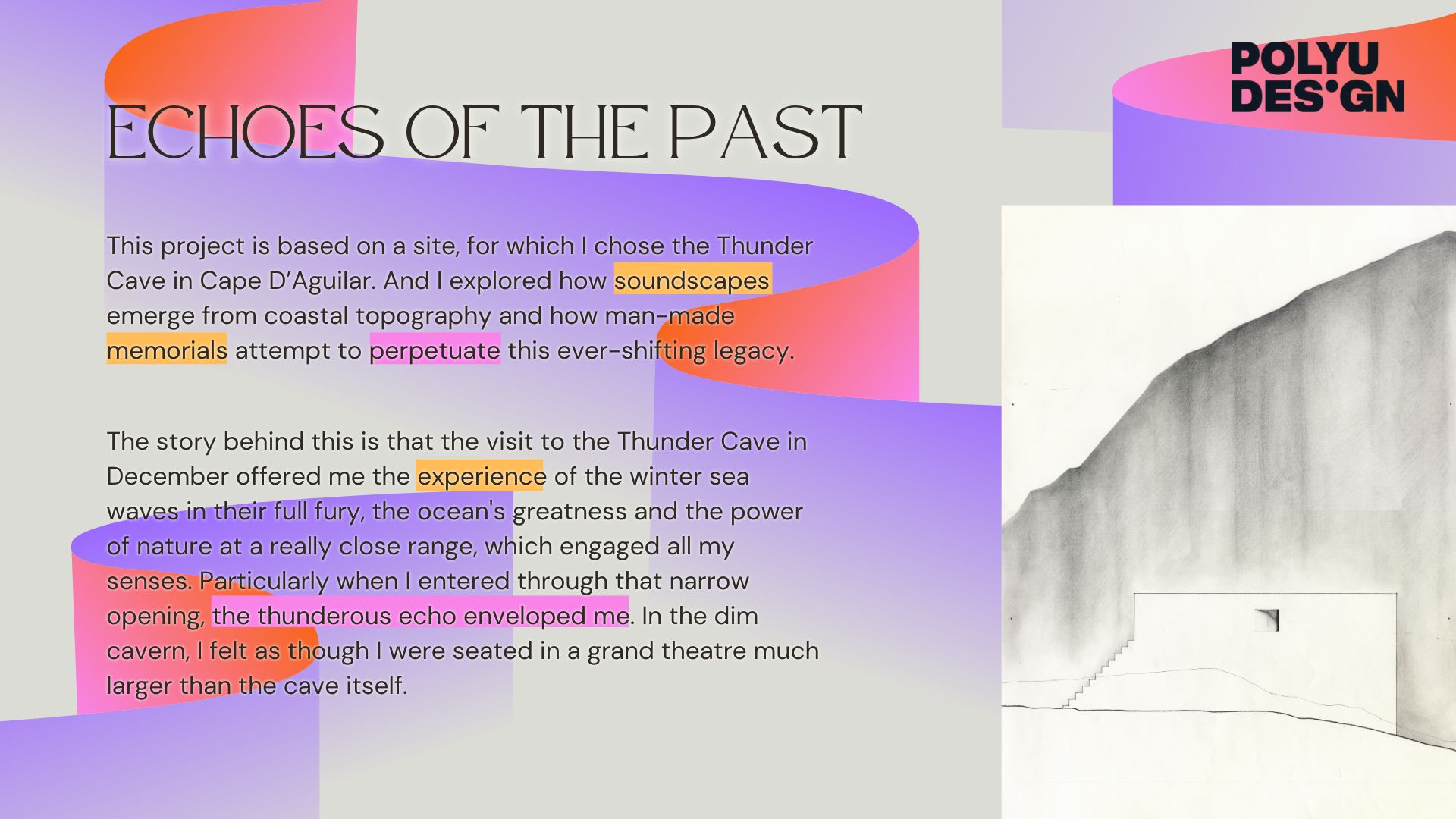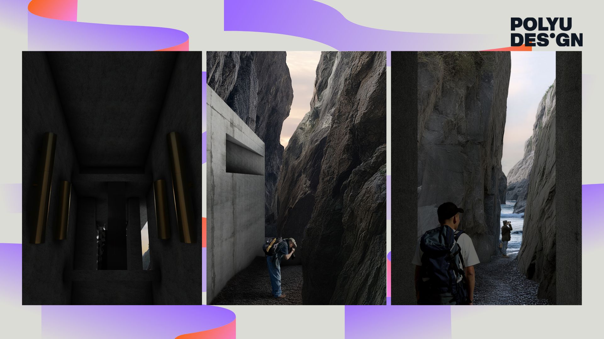 Coco’s project explores the creation of a coastal aeolian memorial at Thunder Cave, Cape D’Aguilar, Hong Kong, aiming to preserve and celebrate the unique acoustic and morphological features of the cave. The concrete structure sits within a Geo gap formed by a collapsed sea cave, designed to endure for millennia, emulating the cave's natural soundscape through its interaction with wind, water, and pebbles.