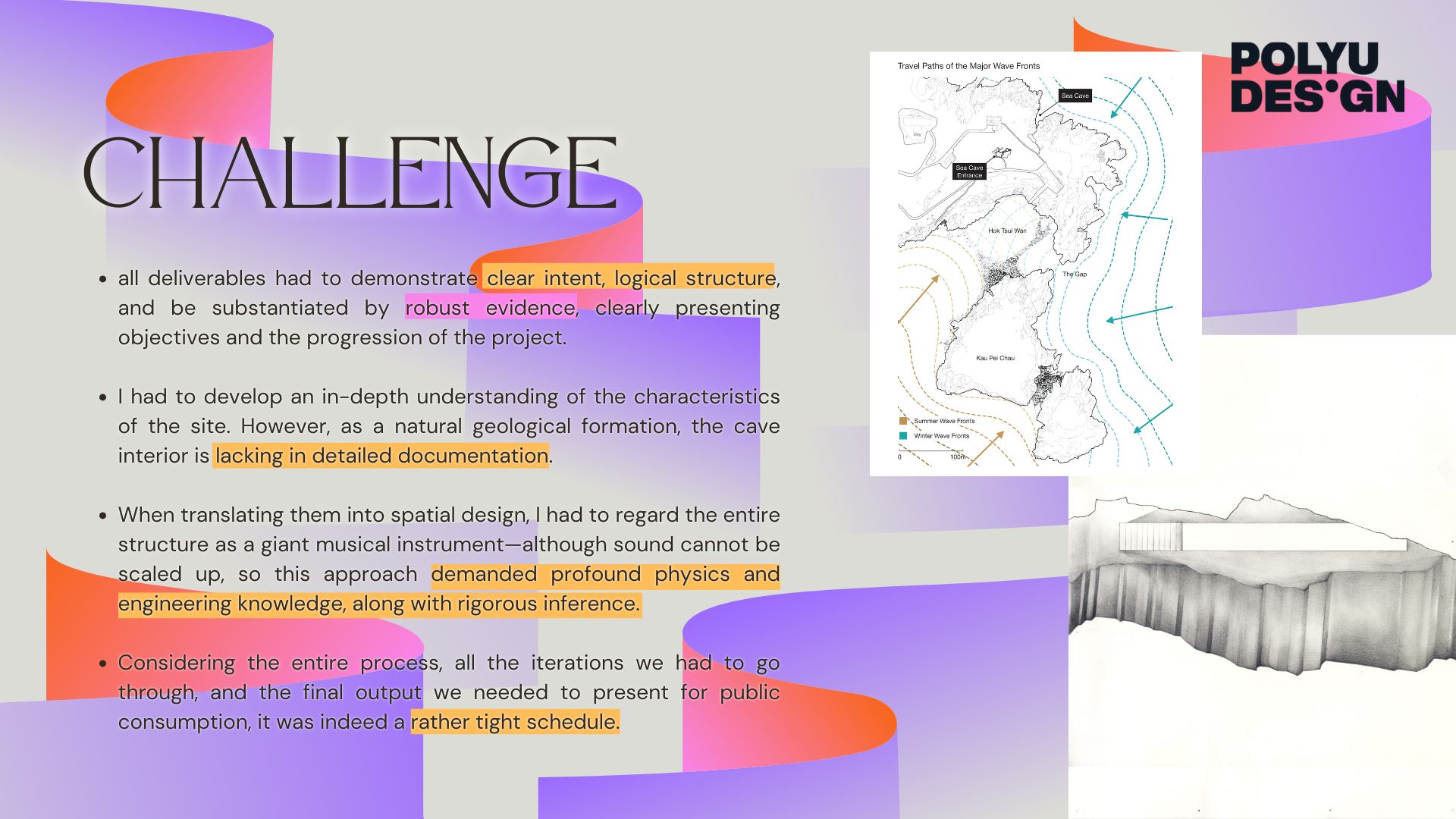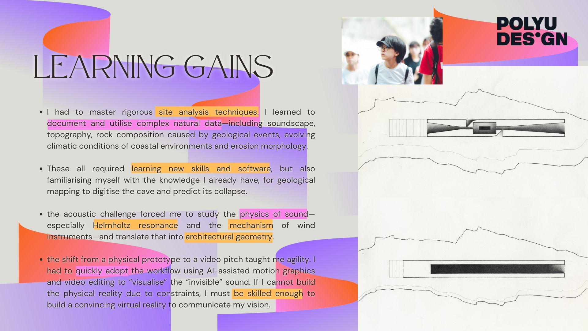 Throughout her narrative, Coco displays high levels of self-awareness regarding both her strengths and her limitations. She openly admits that her "modelling and rendering skills still need strengthening" and confesses that the acoustic problem remained technically "unsolved" in the physical sense. By reflecting on the "sensations" of the cave and how they translated into her research theme, she shows an ability to connect personal growth and sensory experience to academic output.