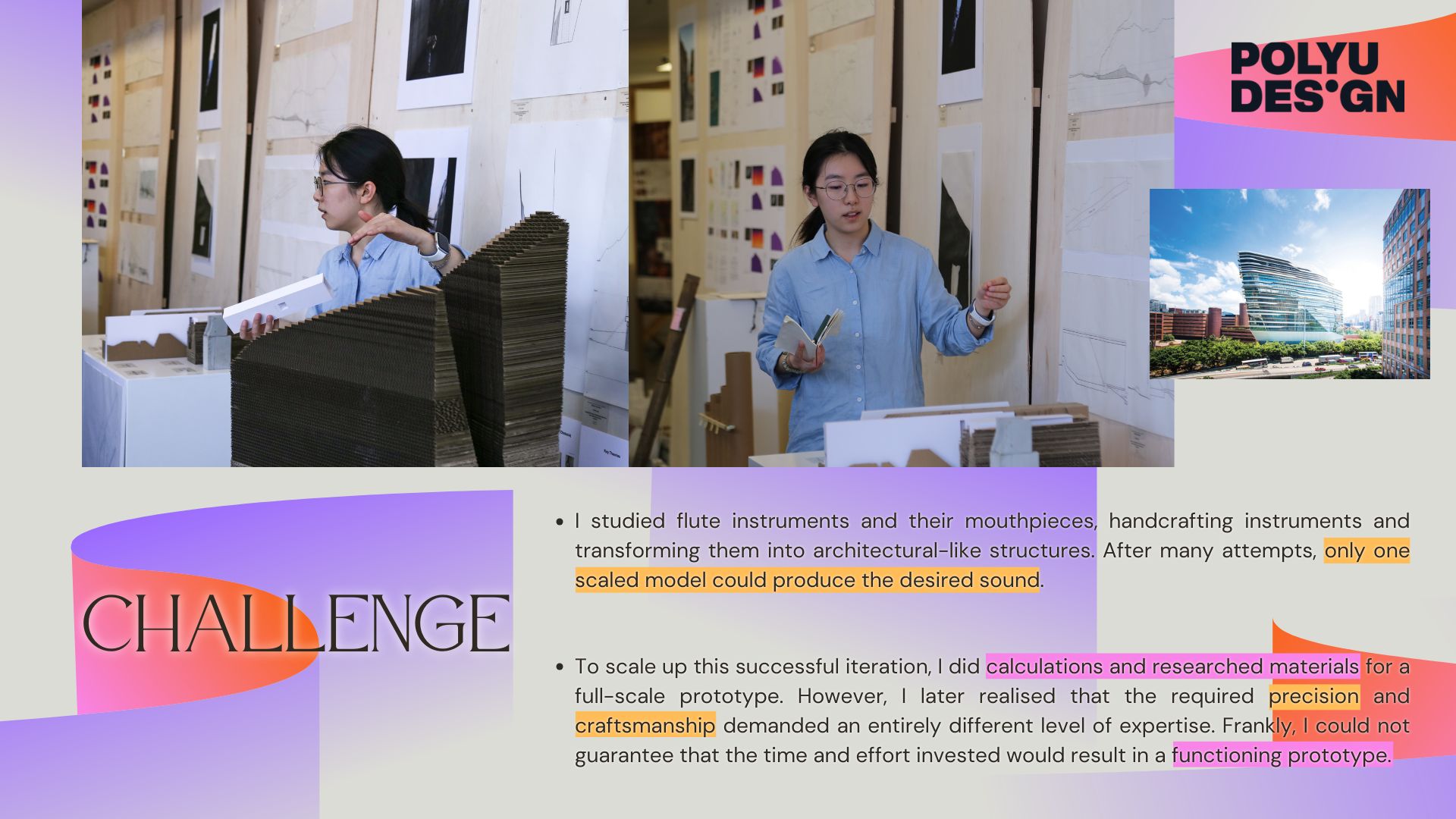 Coco engaged in "design-through-making" by handcrafting flute mouthpieces and scaled models to test her acoustic theories. She discovered through this process that while a small model worked, scaling it up to a full-size architectural prototype presented immense challenges in precision and craftsmanship.