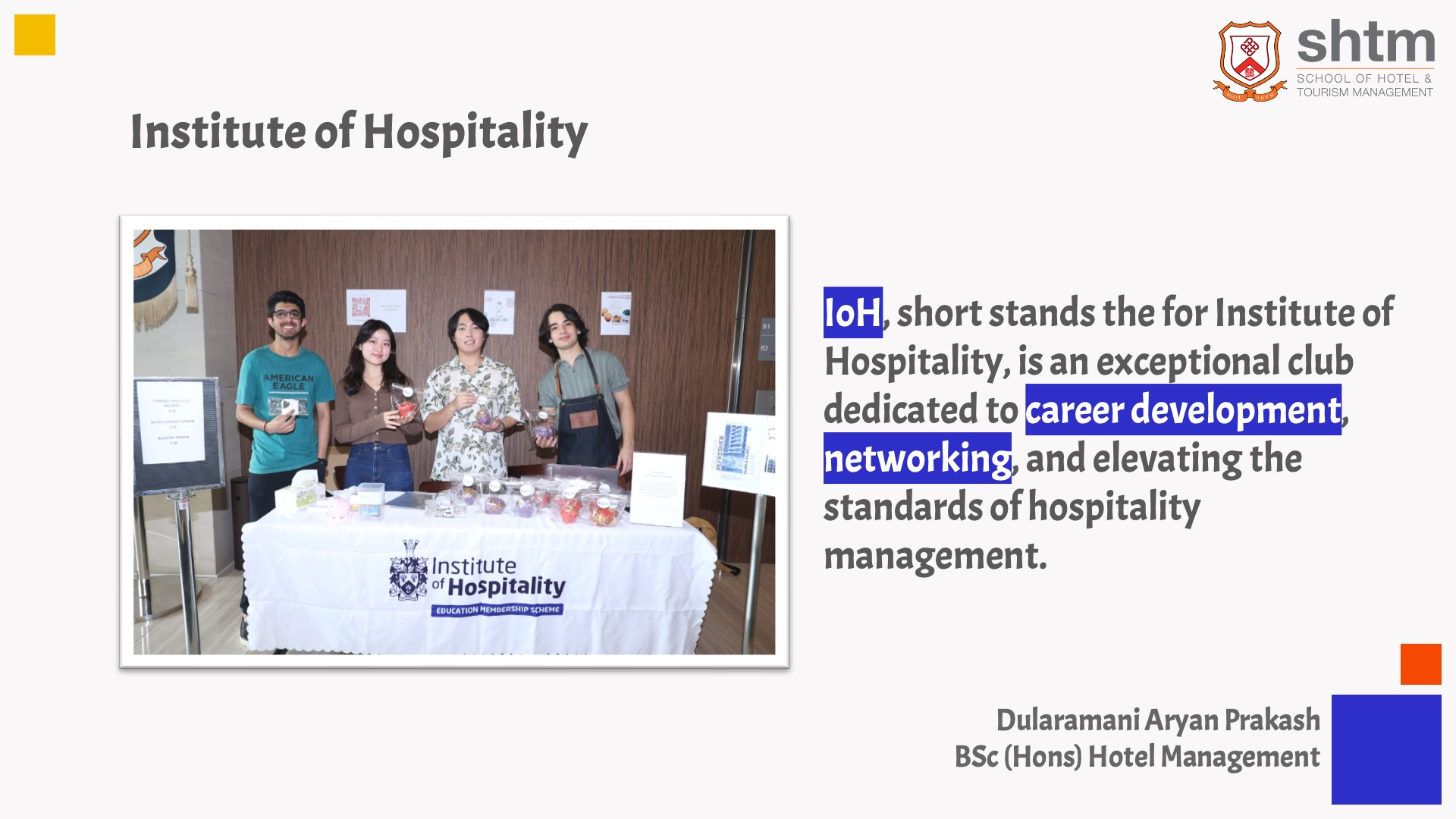 The Institute of Hospitality (IoH) focuses on career development, networking, and advancing hospitality management. Our passion for hospitality inspired us to join and learn from industry leaders. We were especially drawn to the 'Women in Leadership' project, highlighting women’s roles in the sector. We organized events featuring speakers like Ms. Winnie Woo and Ms. Michelle Liu, showcasing their insights. As a team, we coordinated event planning, secured speakers, and managed logistics. Collaborating with Freshlane, we hosted a seminar and a snack stand, which allowed us to develop our project management, problem-solving, and teamwork skills, overcoming challenges to achieve success.