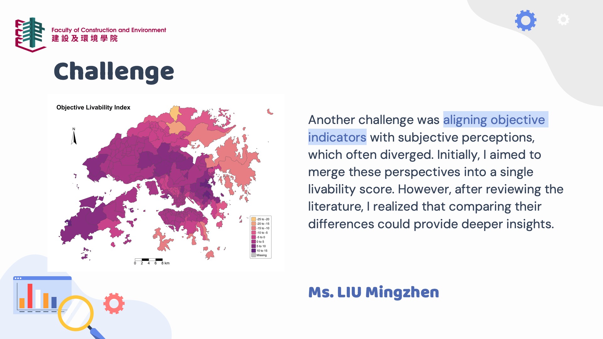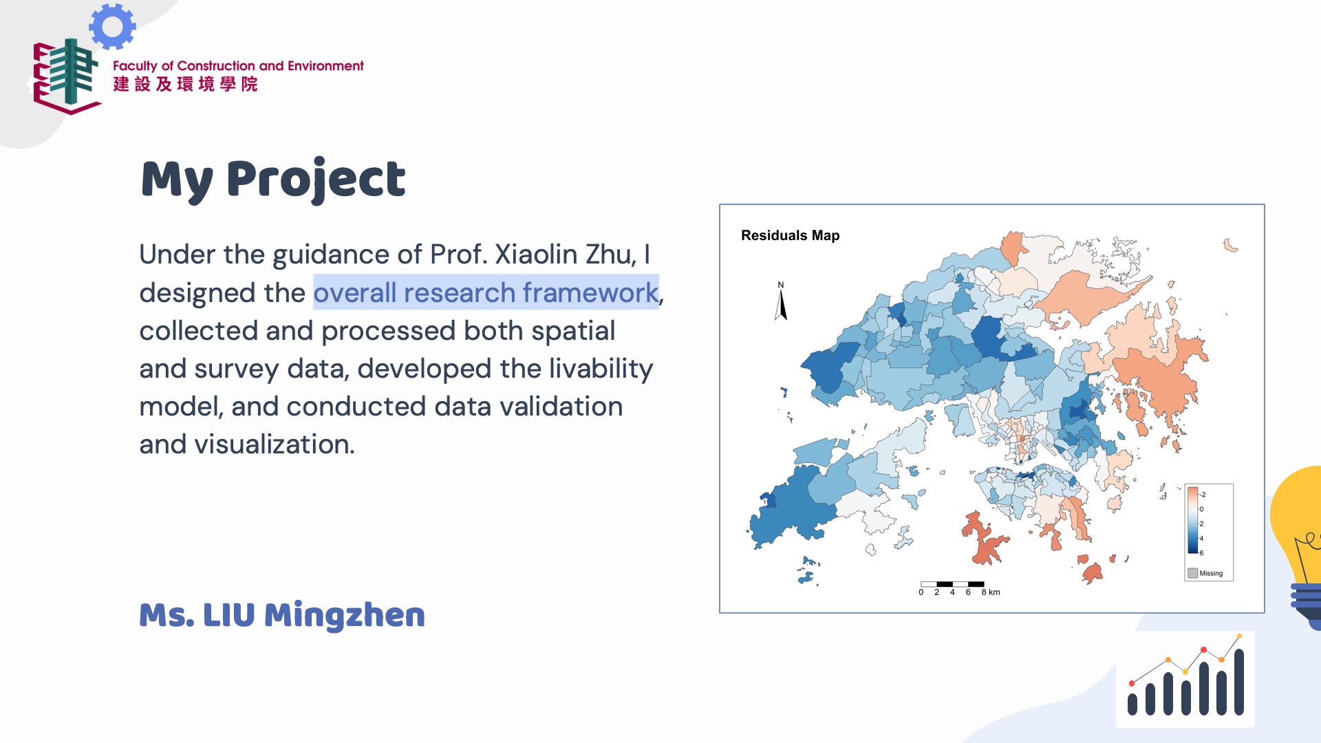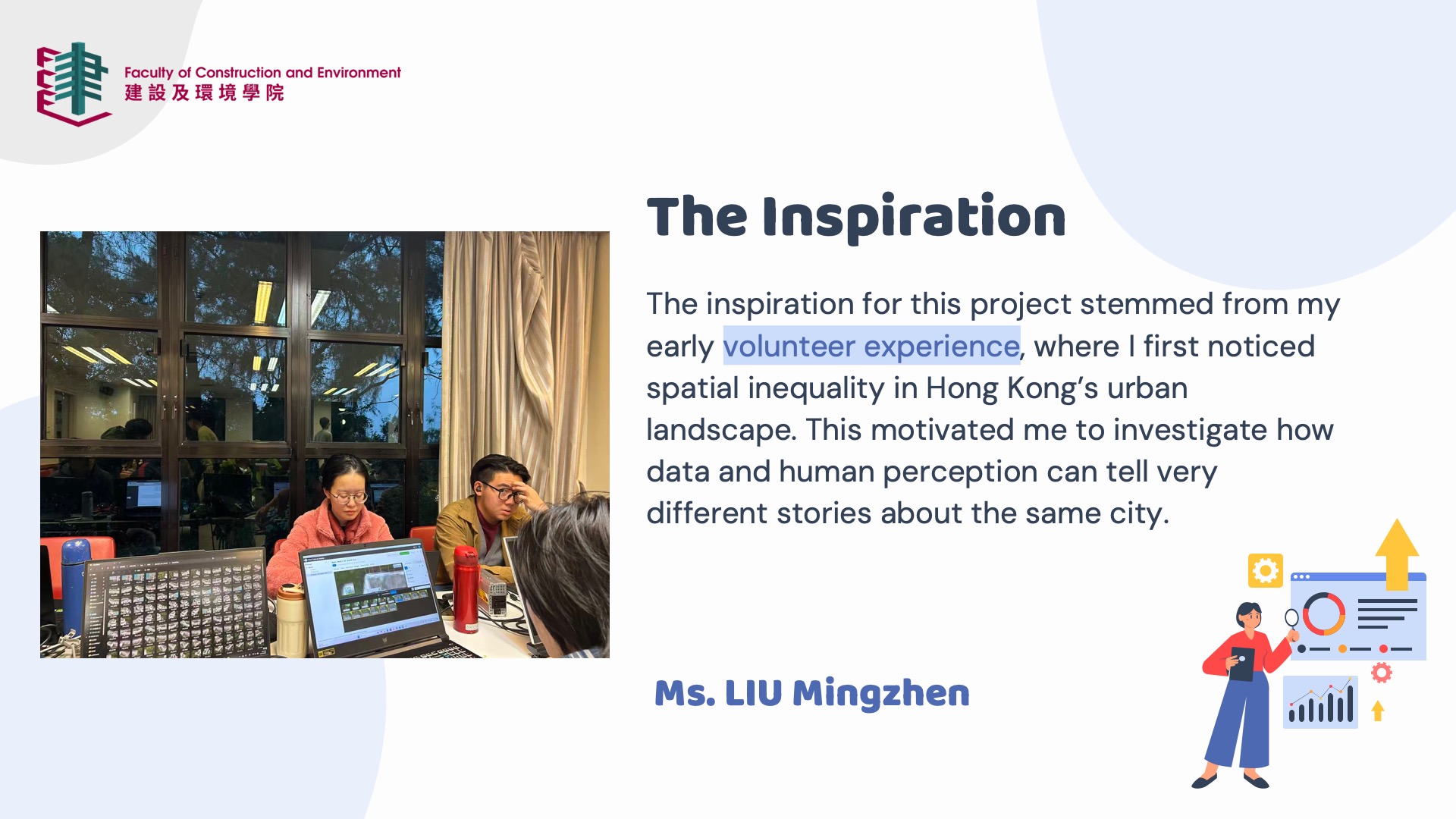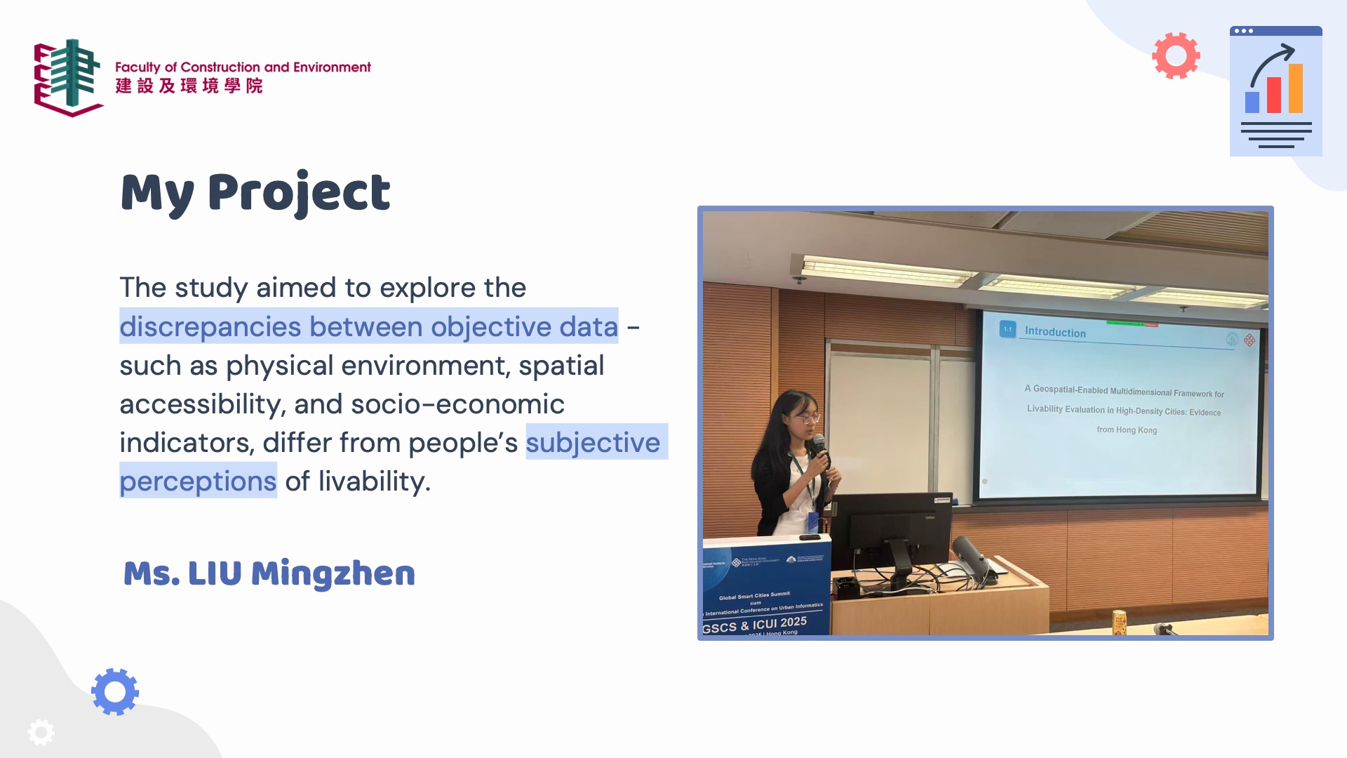 During her two-year research on livability in Hong Kong, LIU Mingzhen found that objective data and residents’ perceptions often tell different stories. With Professor Zhu’s guidance, she developed a geospatial framework and compared objective indices with survey-based subjective assessments. Integrating diverse datasets and managing time were major challenges, but she overcame them with systematic planning and technical innovation.