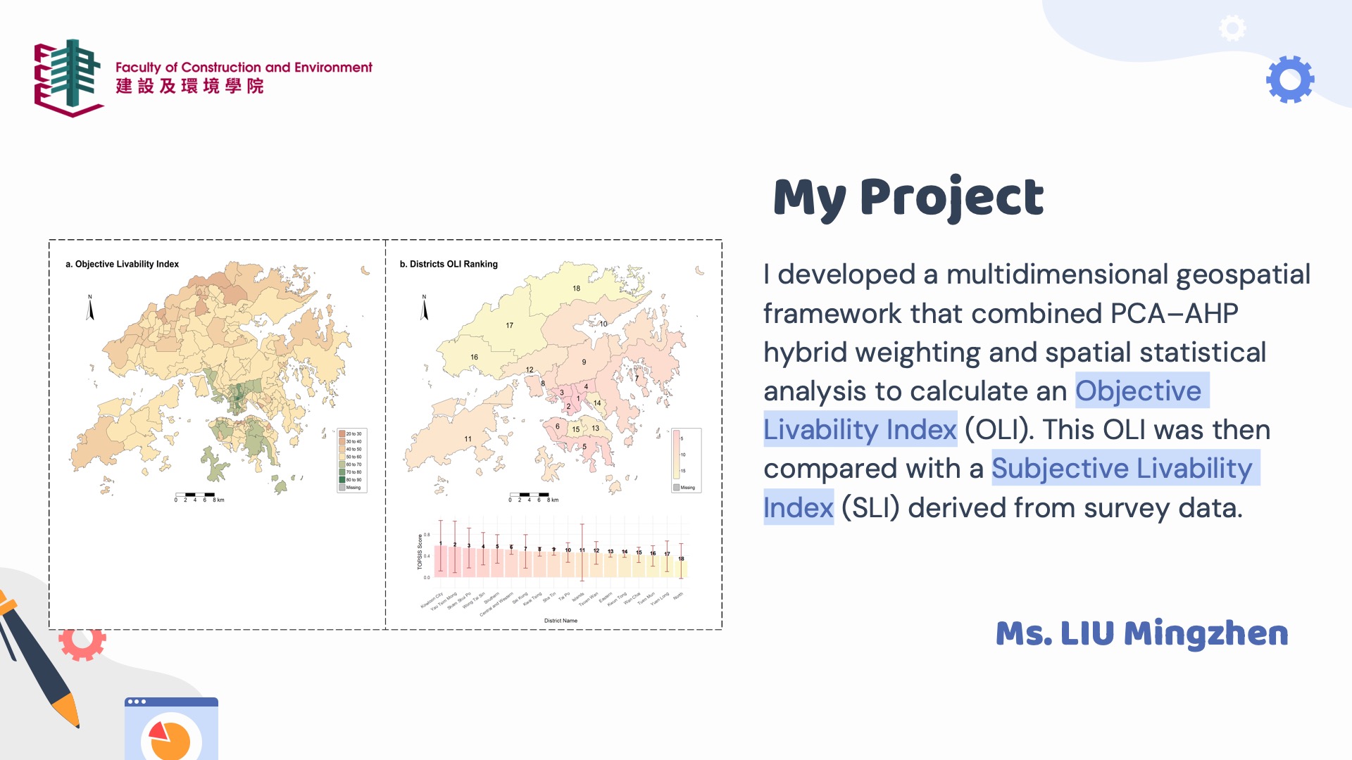 Mingzhen designed a multidimensional geospatial framework that combined PCA–AHP hybrid weighting and spatial statistical analysis to calculate an Objective Livability Index (OLI). She learned to integrate multiple datasets (census, remote sensing, surveys) and apply normalization and hierarchical weighting systems. These modeling and statistical skills are essential in construction for evaluating project impacts, optimizing resource allocation, and supporting evidence-based decision-making.
