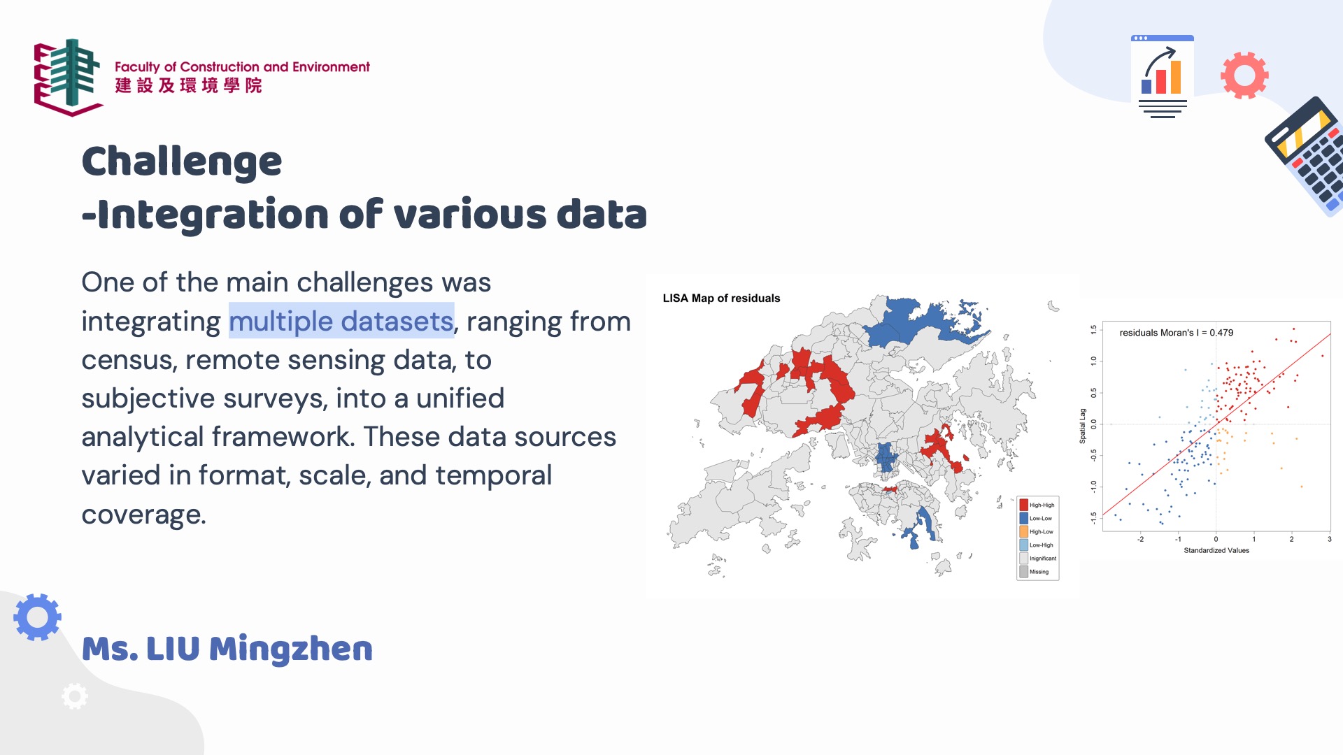 Mingzhen faced complex challenges such as integrating diverse datasets (census, remote sensing, surveys) and aligning objective indicators with subjective perceptions. She overcame these by applying geostatistical normalization, designing hierarchical weighting systems, and using residual and spatial autocorrelation analyses. This demonstrates her ability to tackle multifaceted problems with creative and analytical solutions—a key lifelong skill.