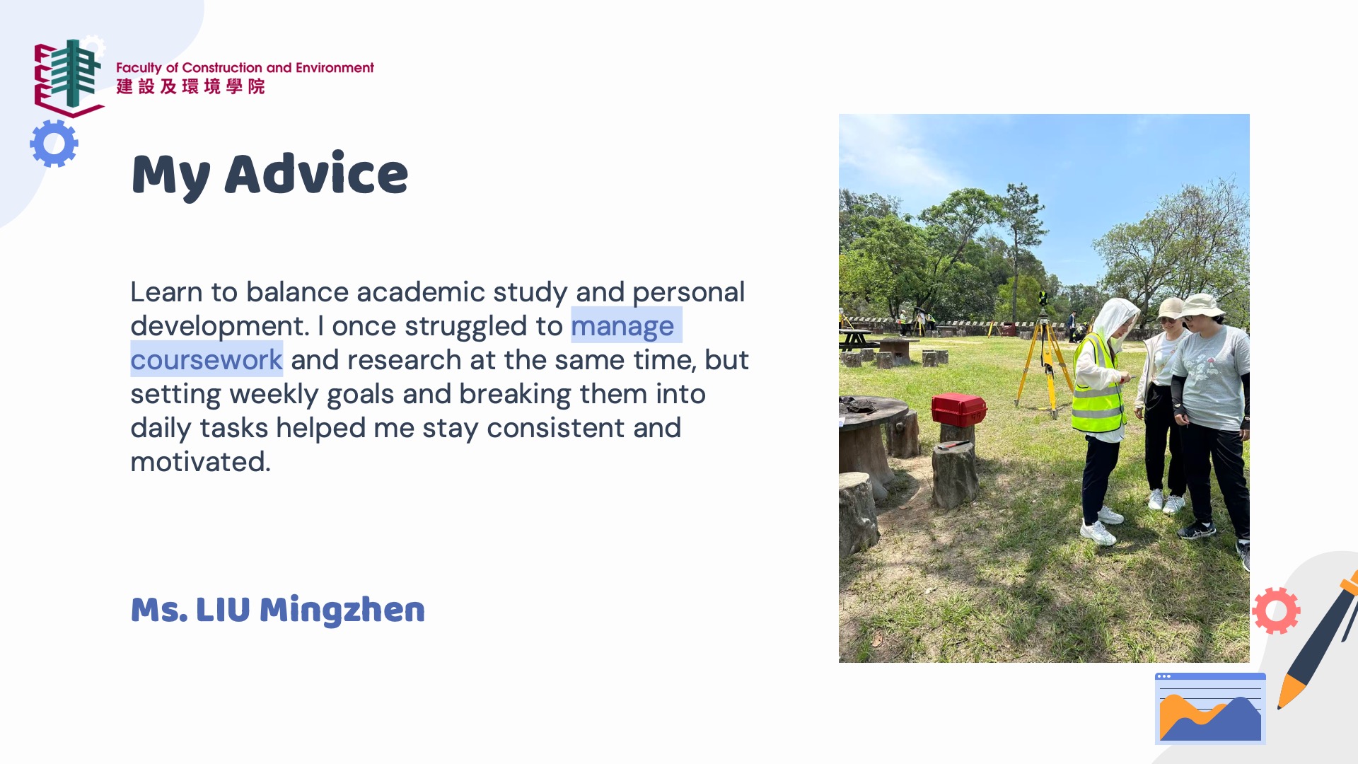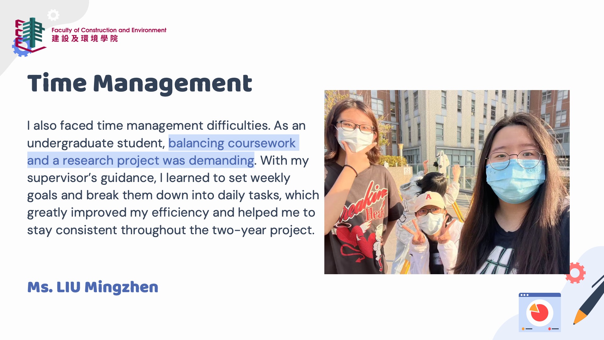 Balancing coursework with a demanding two-year research project required Mingzhen to develop strong time management skills. With her supervisor’s guidance, she learned to set weekly goals and break them down into daily tasks, improving her efficiency and consistency. Effective time management is essential for lifelong learning, enabling individuals to juggle multiple responsibilities and maintain productivity.