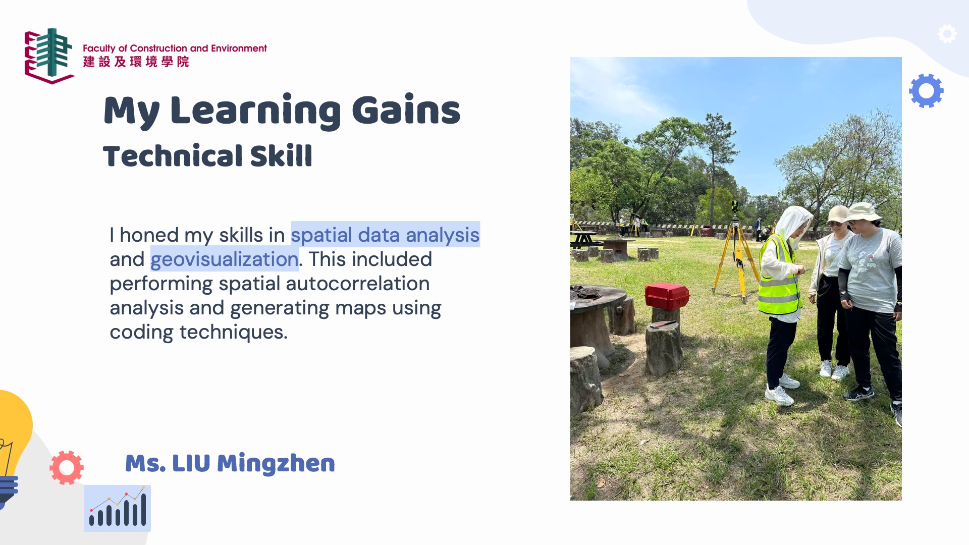 Her project required advanced skills in collecting, processing, and visualizing spatial data using GIS software and coding techniques. Mingzhen performed spatial autocorrelation analysis and generated maps to uncover hidden patterns and inequalities in urban areas. Geospatial analysis is fundamental in construction for site selection, infrastructure planning, and monitoring urban development.