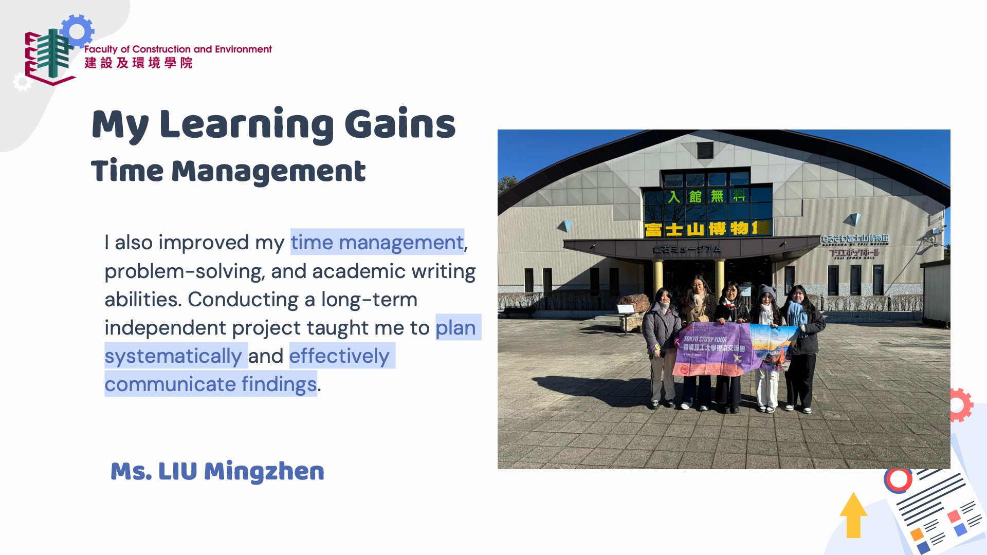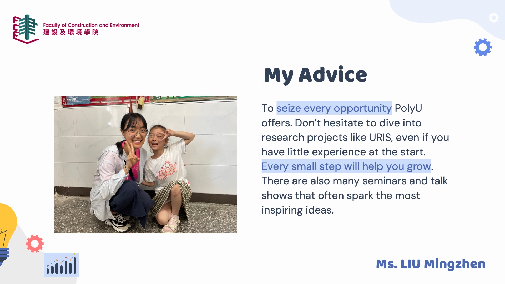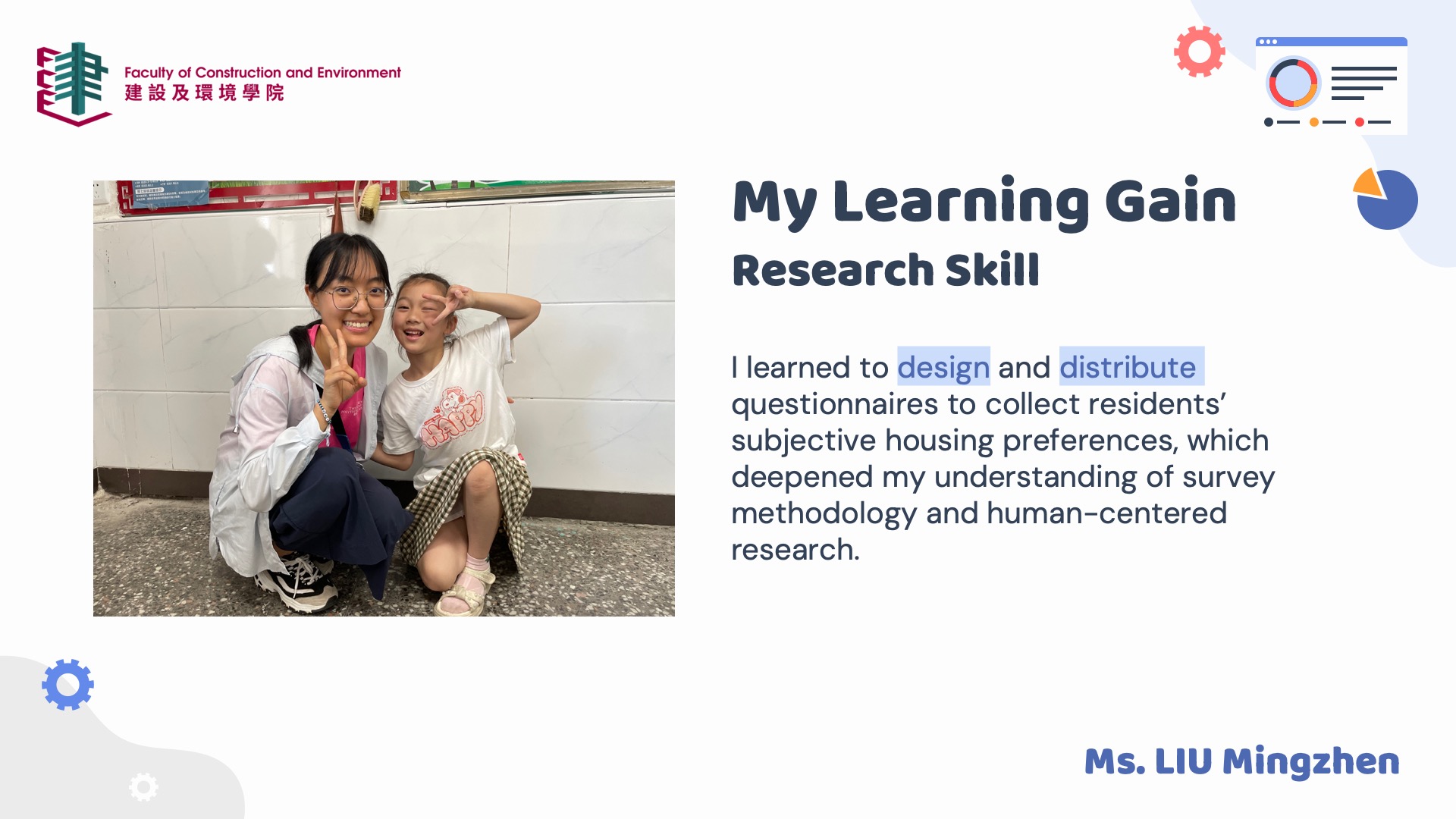 PolyU’s support and research funding enabled her to collect valuable data and present her findings internationally. This experience strengthened her skills in spatial analysis, survey design, and academic writing. Most importantly, Mingzhen learned that urban research should not only focus on data, but also consider the voices and experiences of the people who live in the city.