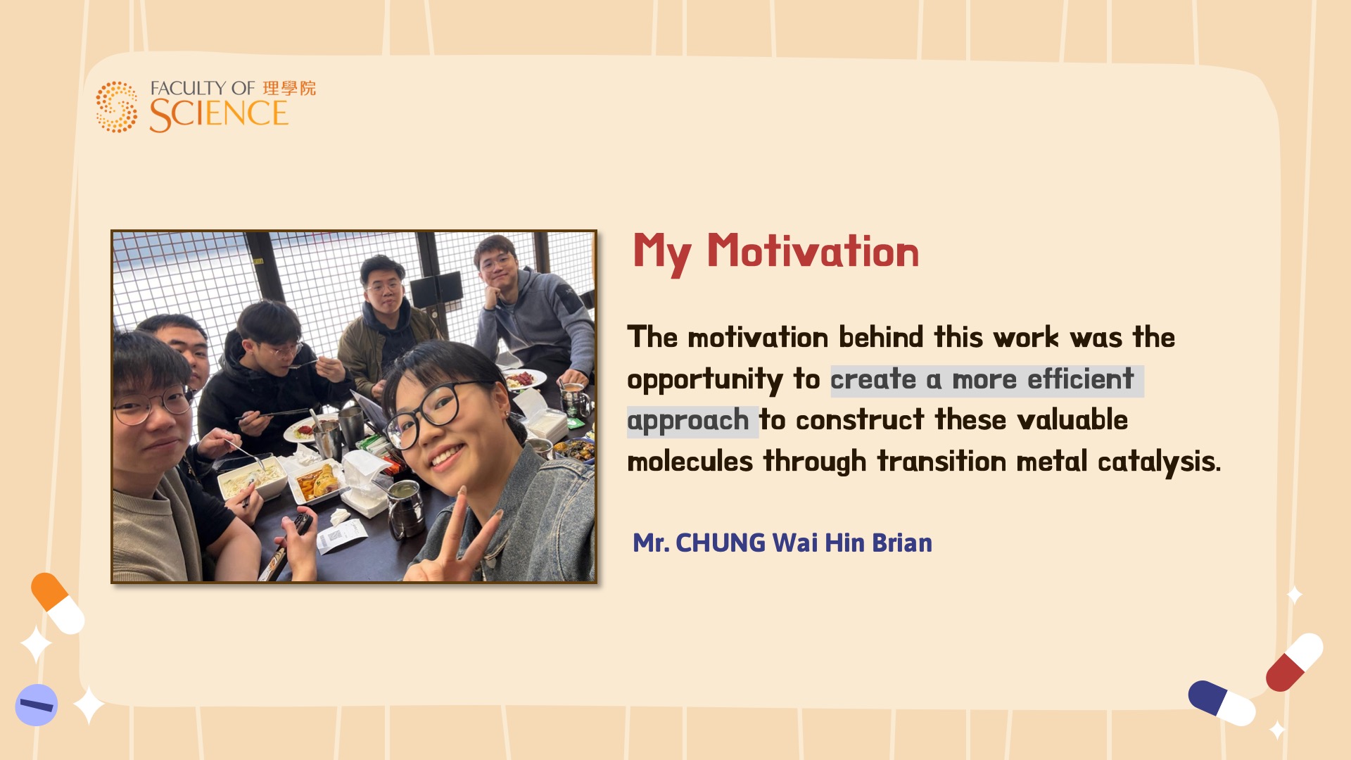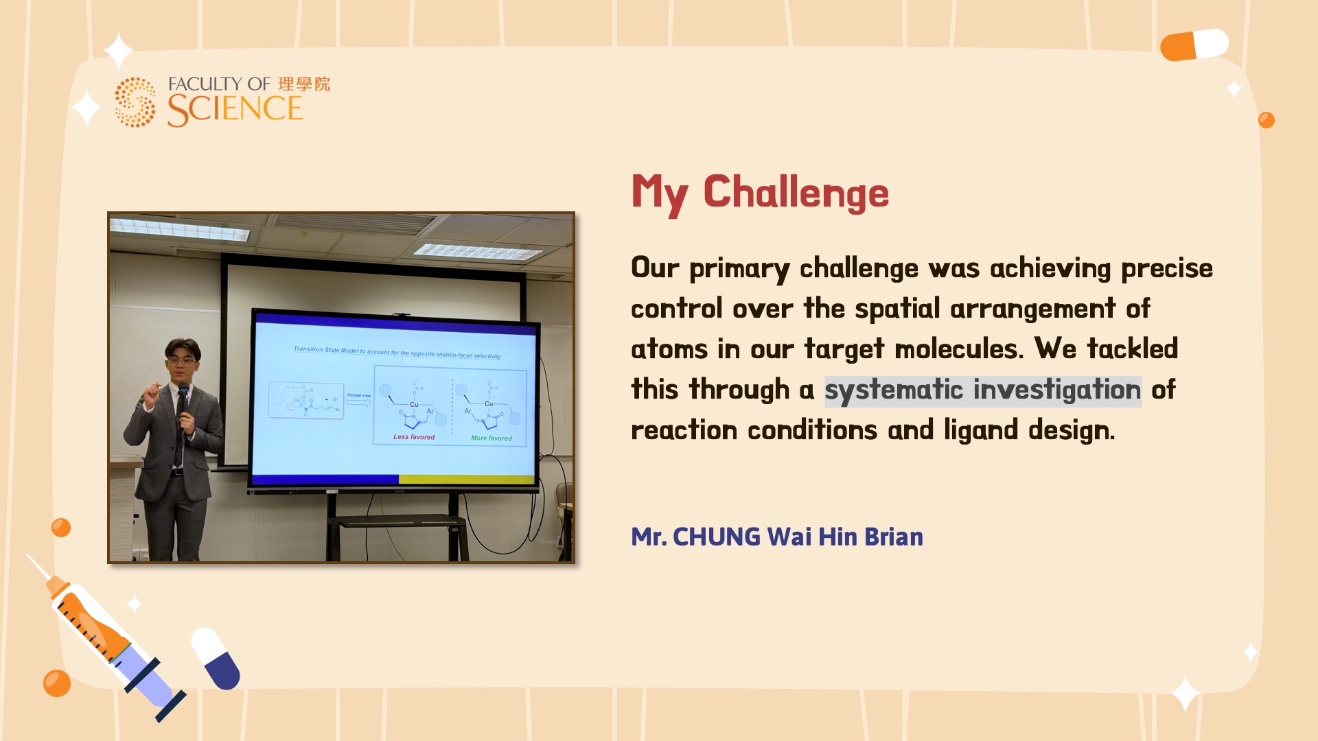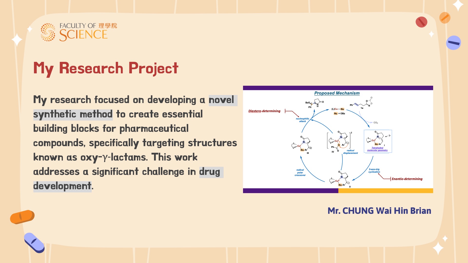 Brian’s research at PolyU led to a breakthrough in synthesizing oxy-γ-lactams, vital for pharmaceuticals. By developing a copper-catalyzed method, his team reduced a multi-step process to a single efficient reaction, saving time and resources. This innovation offers precise control over molecular structure, enhancing drug effectiveness and sustainability in manufacturing.