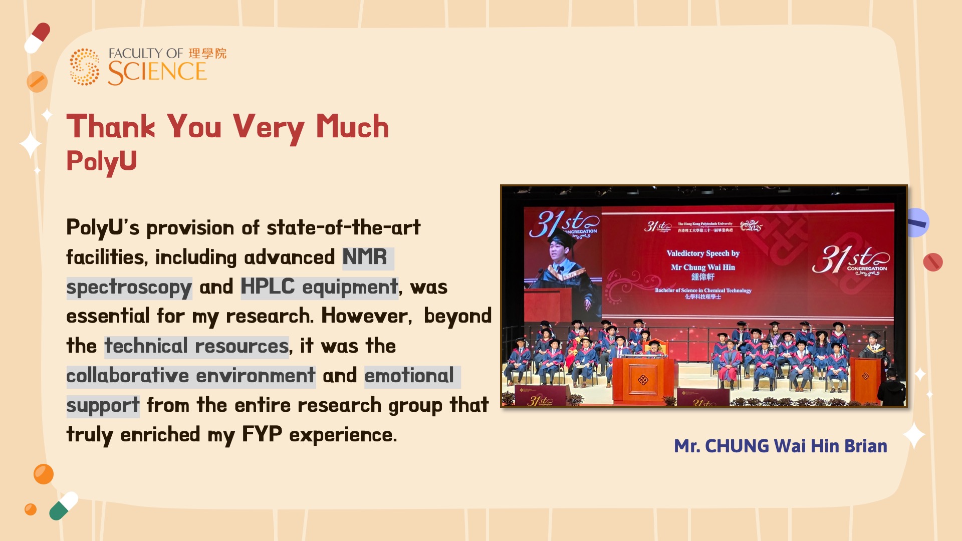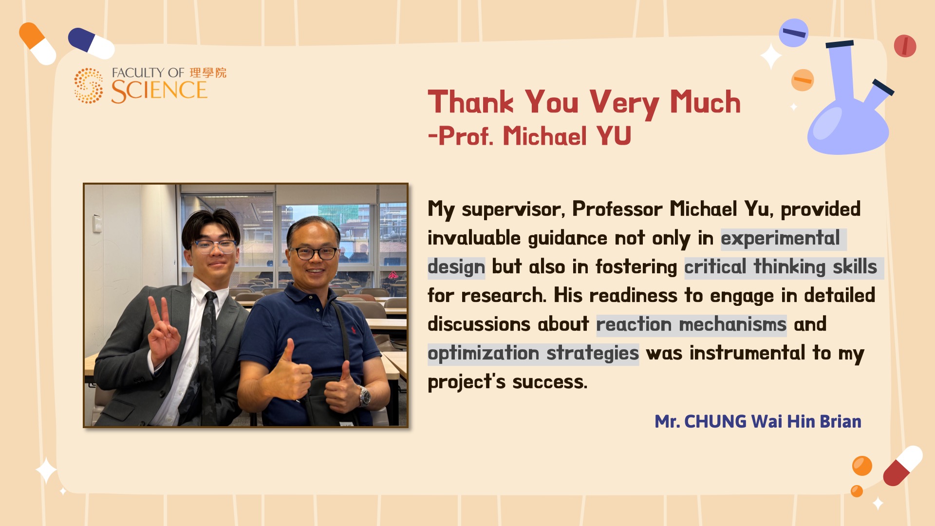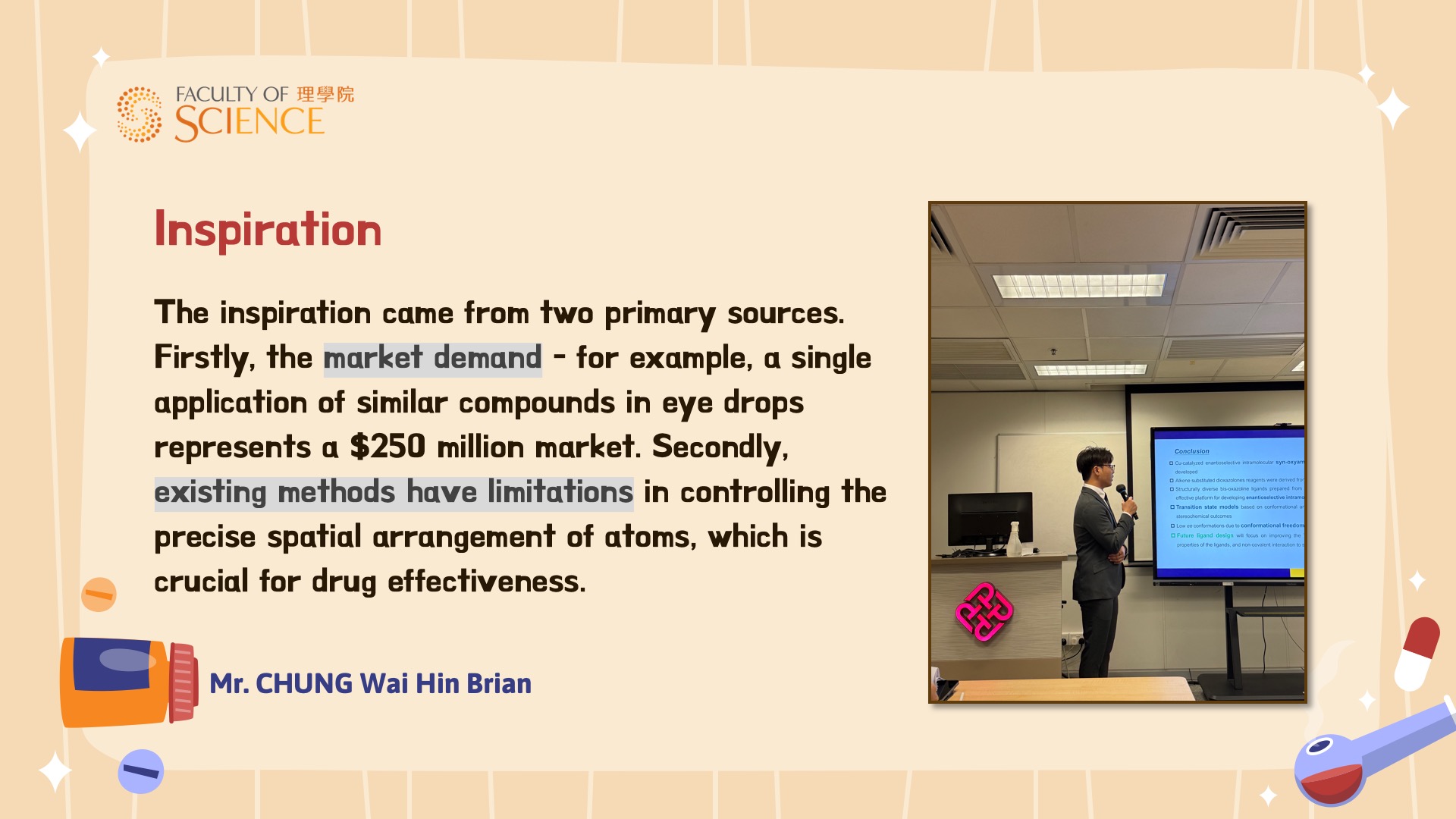 Brian’s research at PolyU led to a breakthrough in synthesizing oxy-γ-lactams, vital for pharmaceuticals. By developing a copper-catalyzed method, his team reduced a multi-step process to a single efficient reaction, saving time and resources. This innovation offers precise control over molecular structure, enhancing drug effectiveness and sustainability in manufacturing.