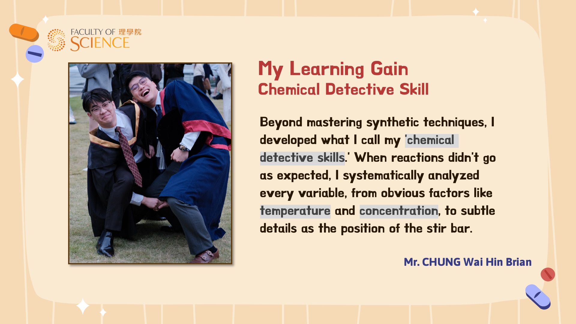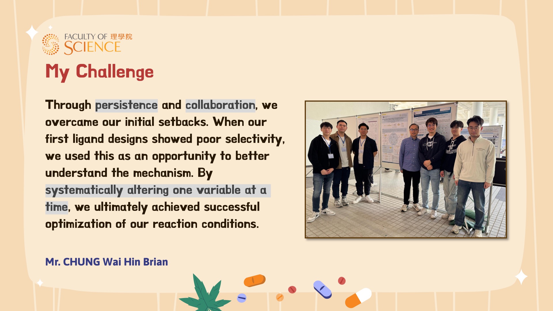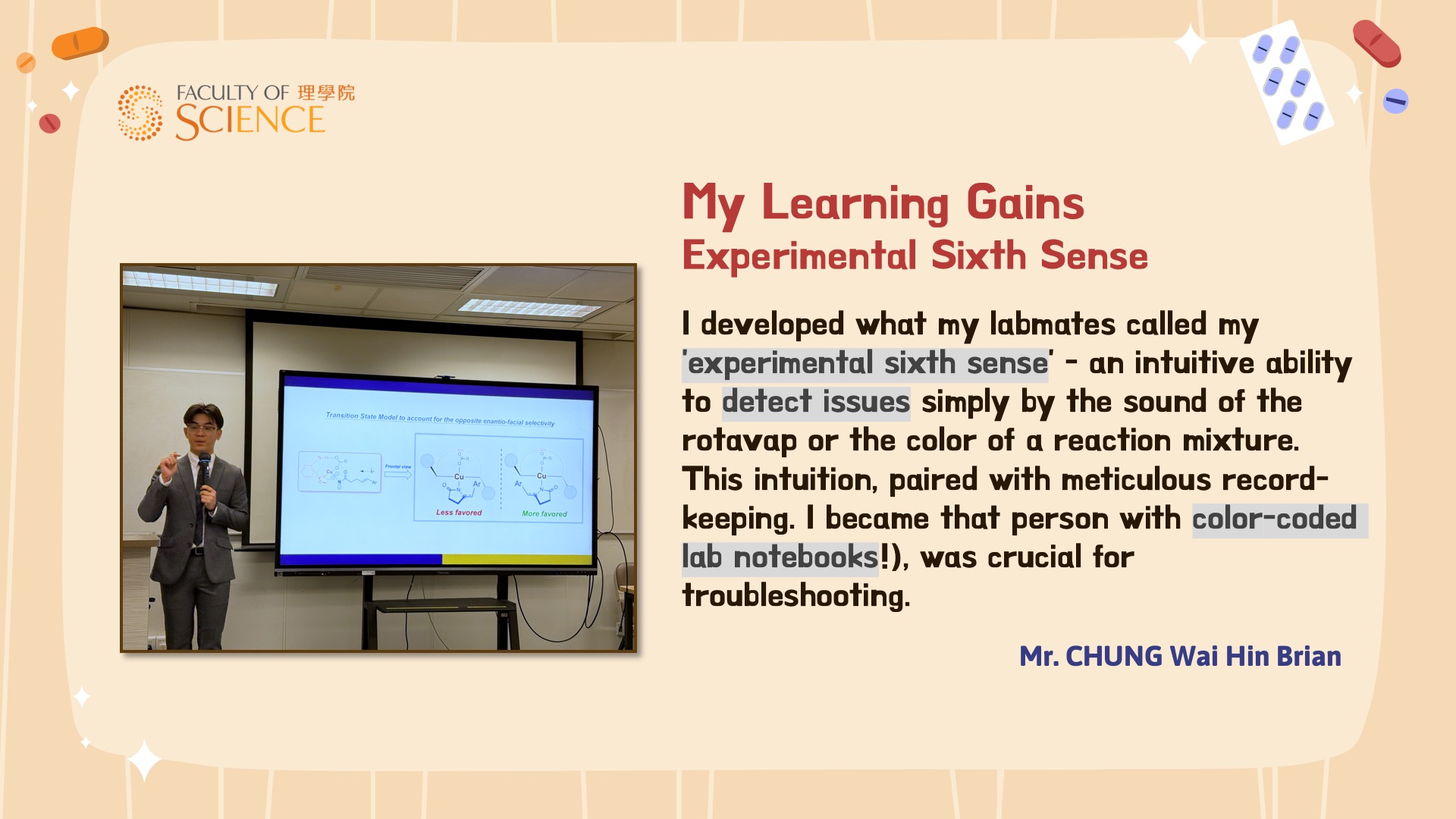 Brian developed a systematic approach to troubleshooting experimental challenges, such as optimizing reaction conditions and ligand design. He learned to analyze every variable methodically, from obvious factors like temperature to subtle ones like stir bar position. This skill is essential for lifelong learning, as it enables individuals to tackle complex problems in any field with logic and persistence.
