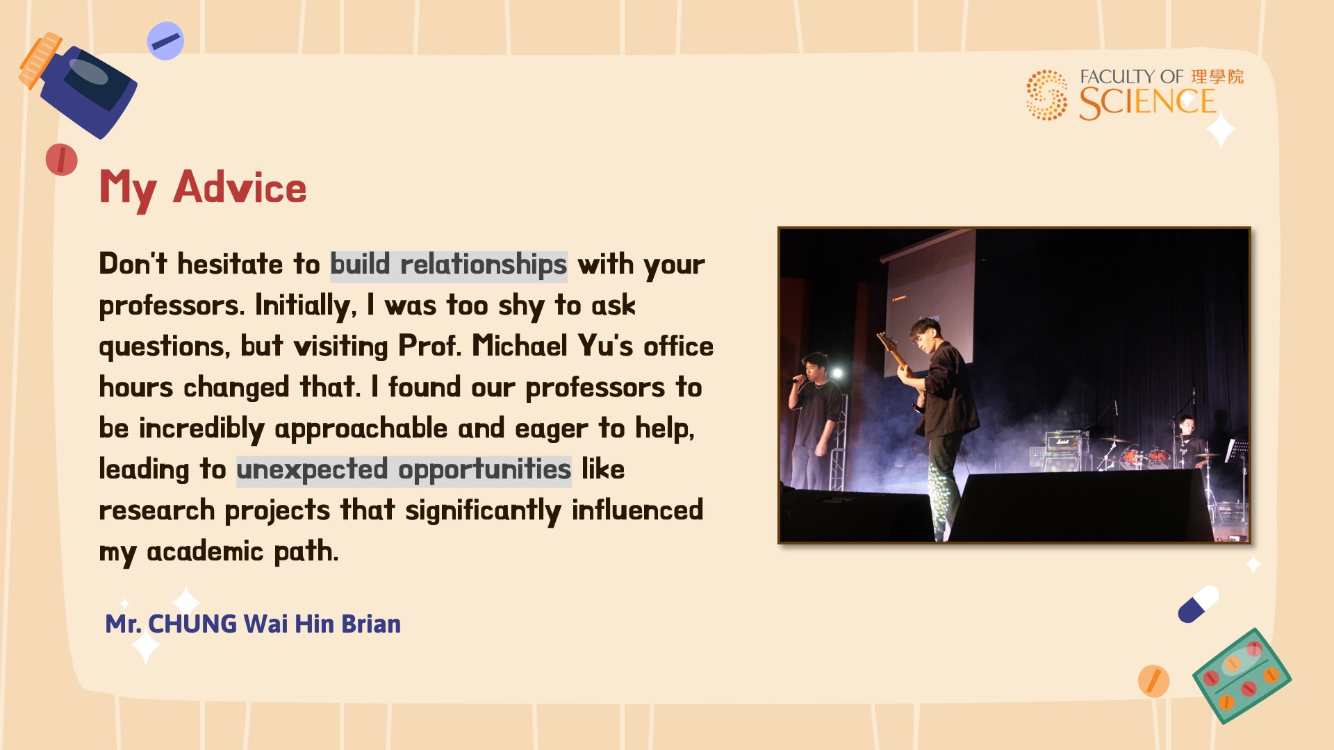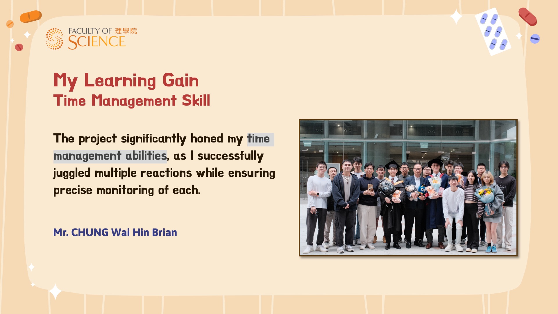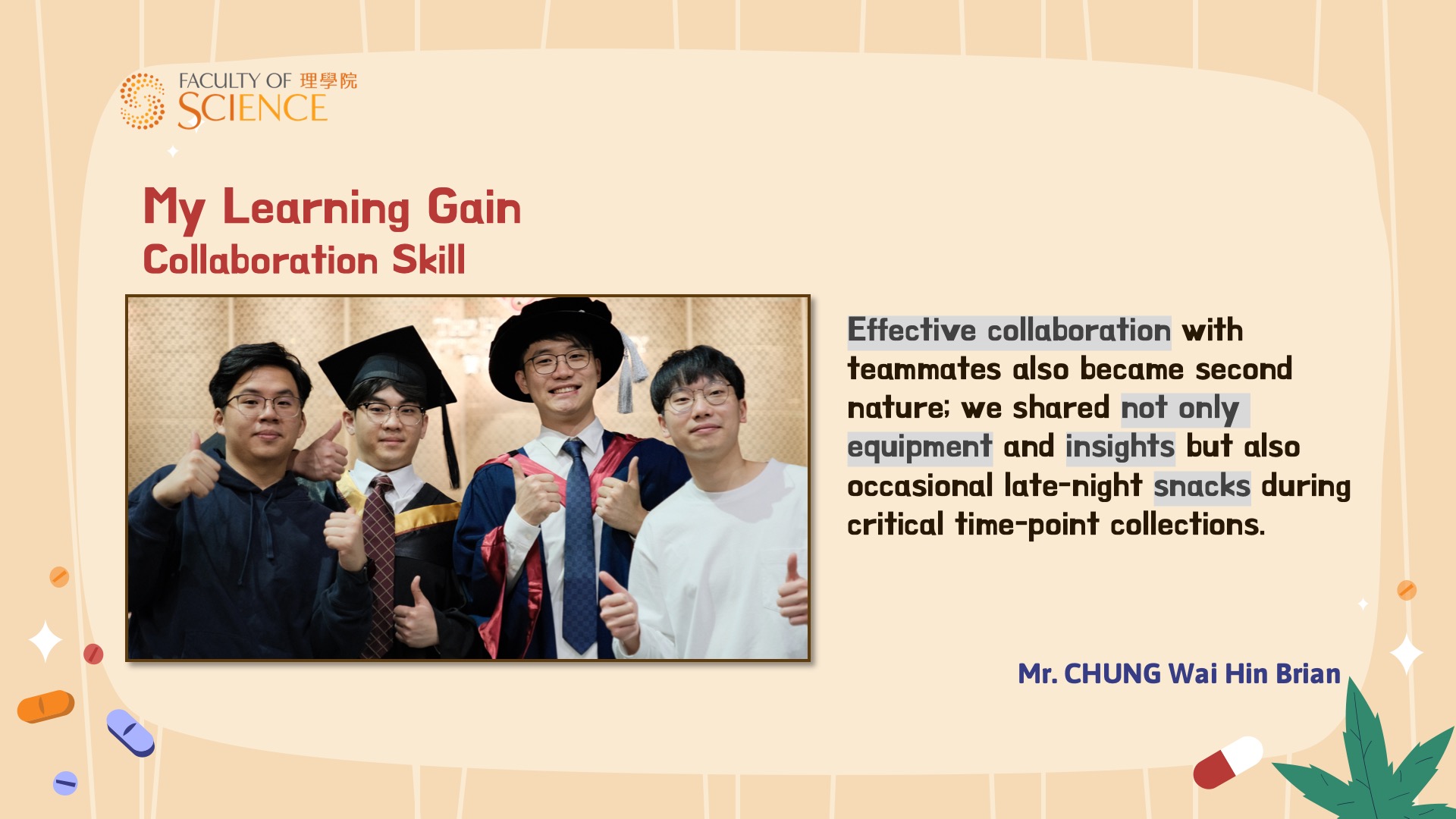 Throughout his project, Brian worked closely with supervisors, mentors, and labmates, sharing equipment, insights, and even snacks during late-night experiments. He also benefited from cross-institutional collaboration through an exchange program. Effective collaboration fosters knowledge exchange, innovation, and support, making it a vital lifelong skill for both professional and personal growth.