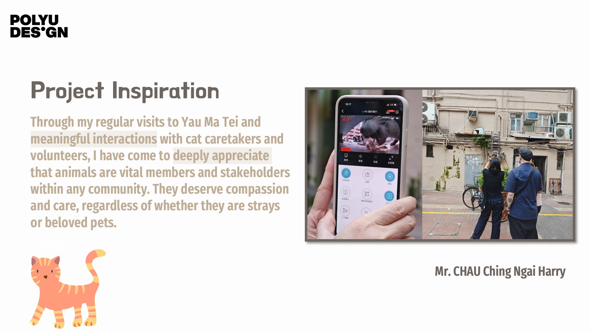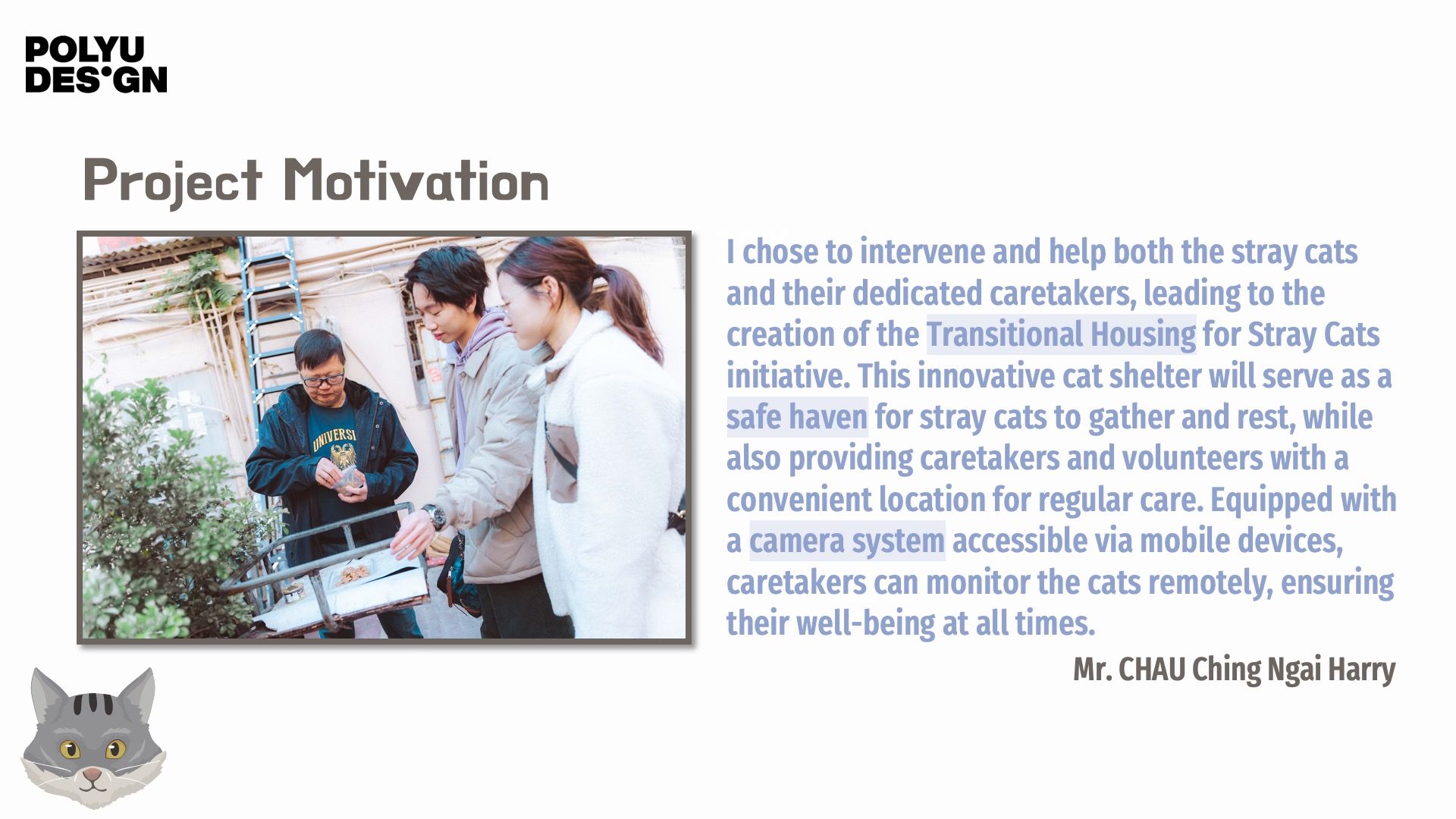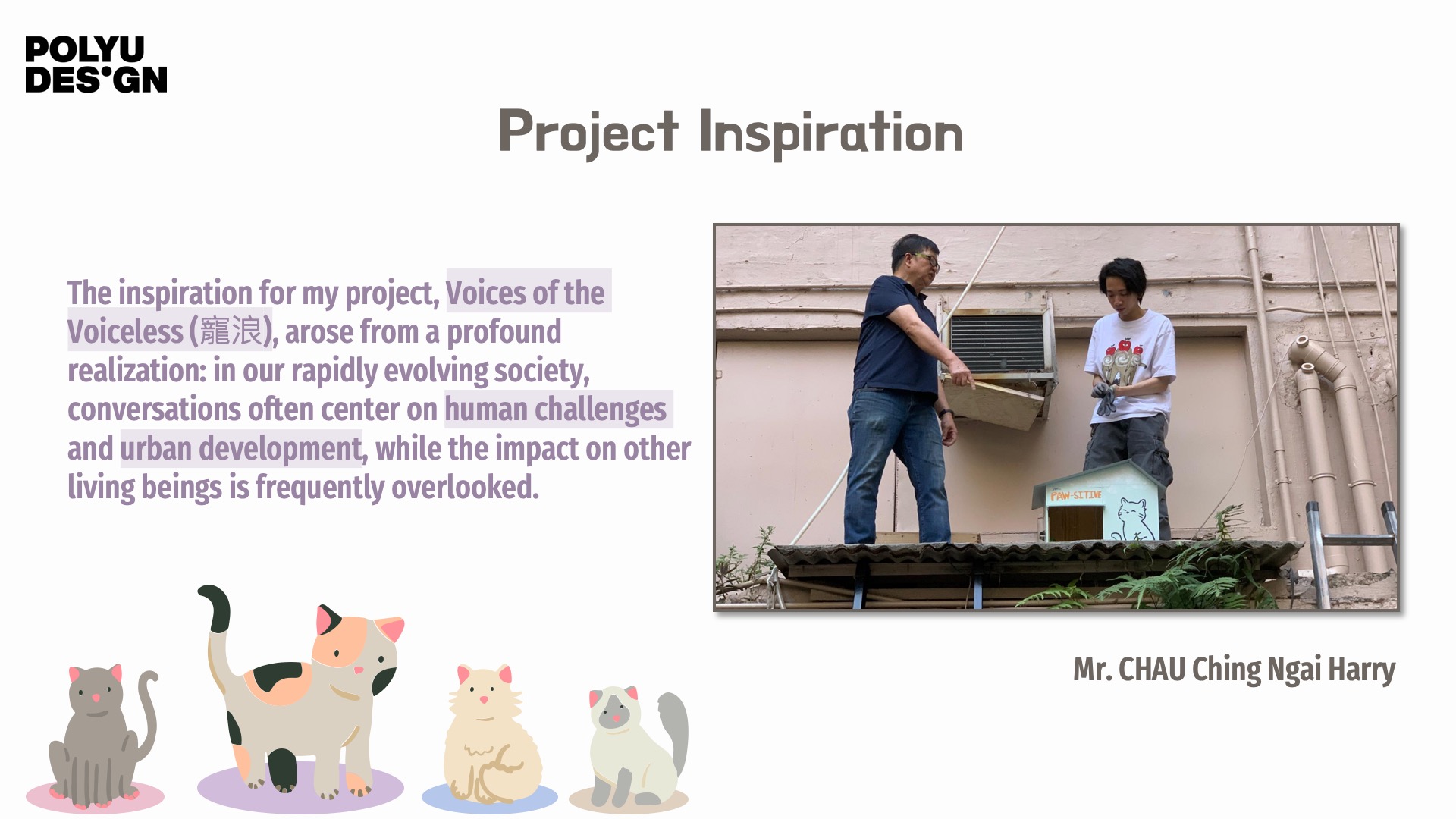 The invisible struggles of stray cats in Yau Ma Tei inspired Harry’s Voices of the Voiceless (寵浪) project. Realizing their importance to the community, Harry designed a Transitional Housing initiative—a shelter with remote monitoring for both cats and caretakers. Initial setbacks, including communication difficulties and rejected ideas, challenged him, but support from local caretakers and volunteers helped him refine his concept. The project not only provides temporary refuge for cats but also raises awareness about animal welfare.