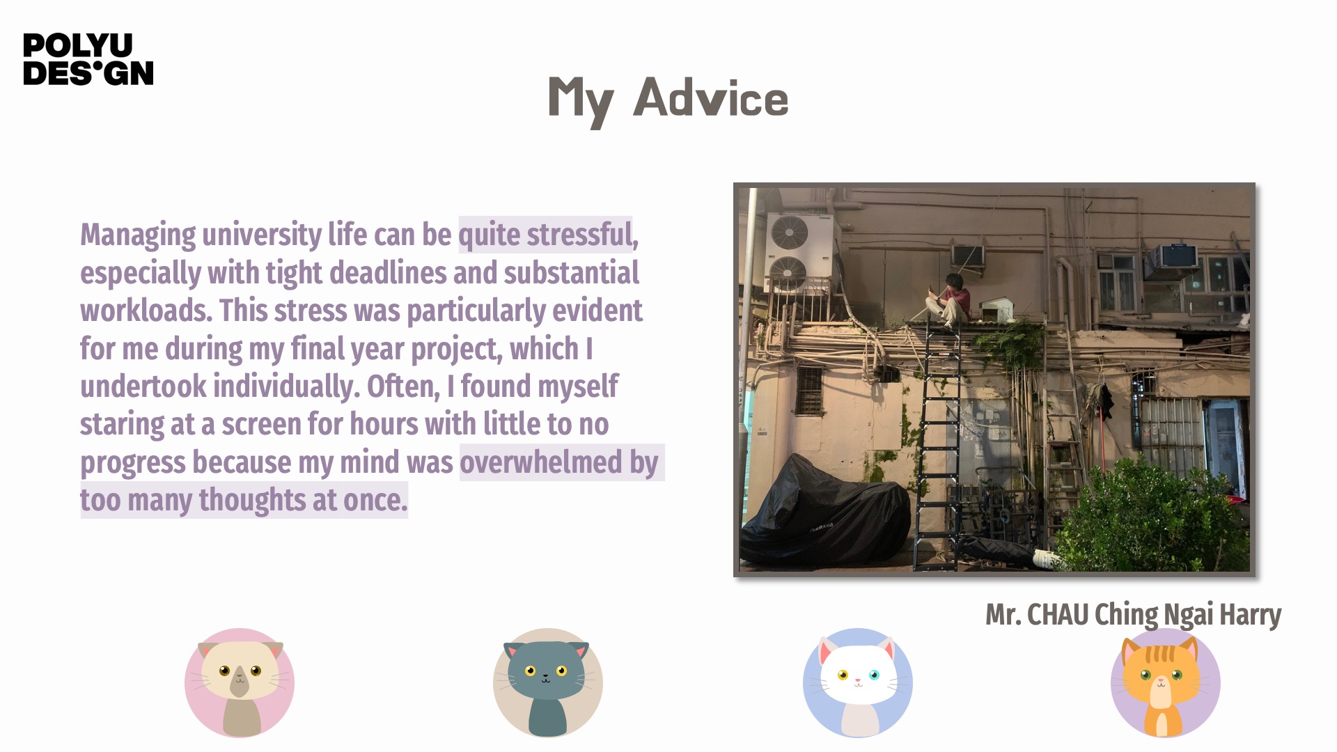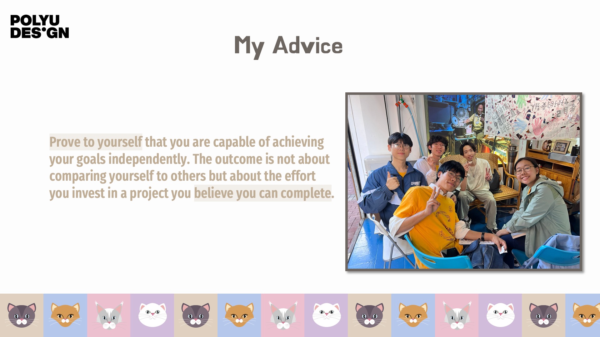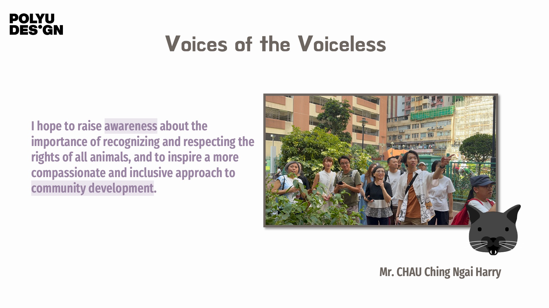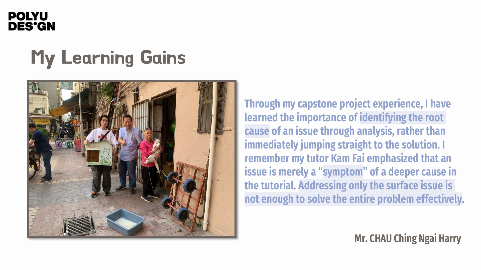 Winning “Tutor’s Choice” at the PolyU Design Show validated Harry’s efforts. He learned to analyze root causes and create solutions that foster compassion and inclusivity, making a lasting impact on both animals and people.