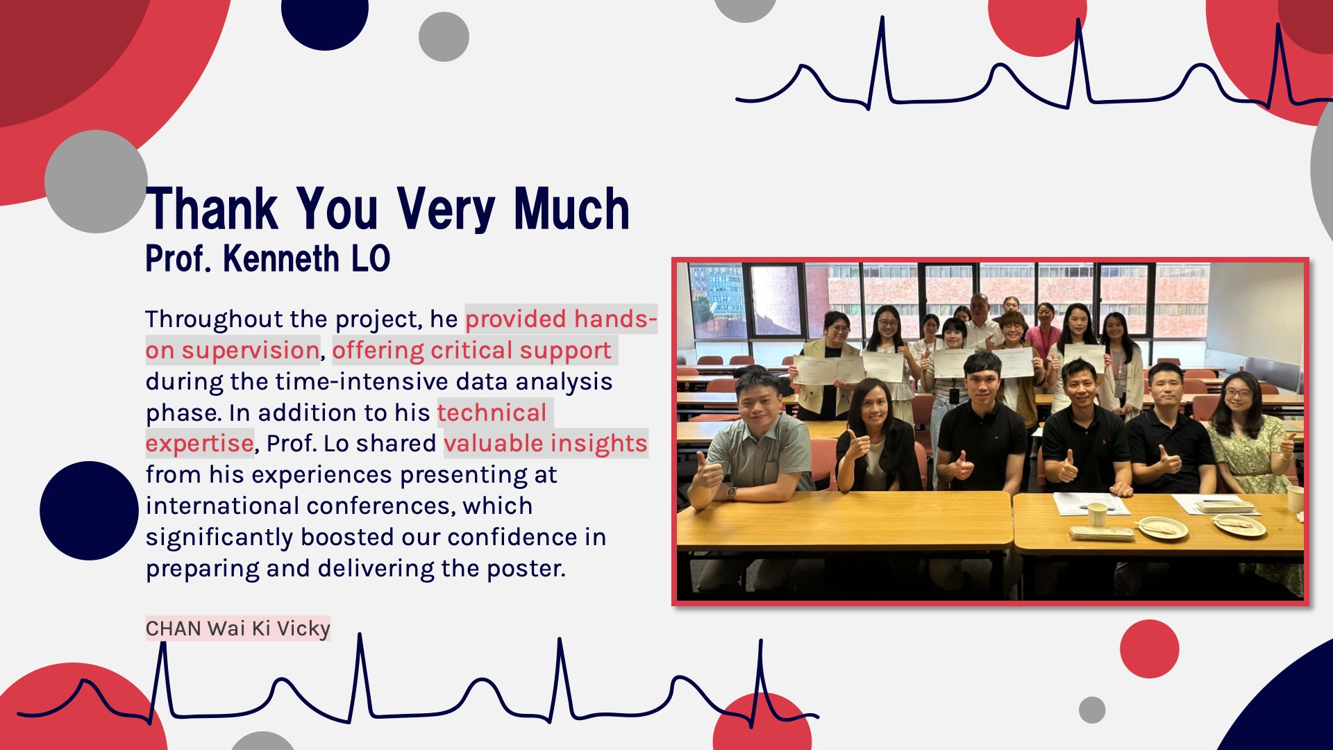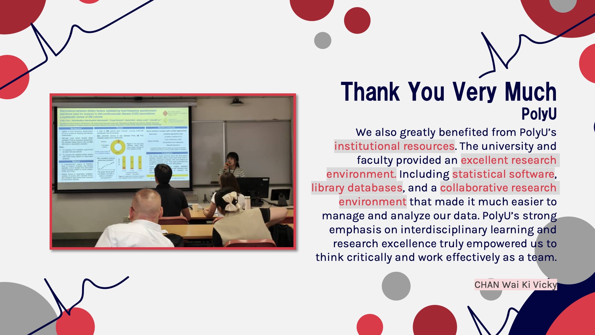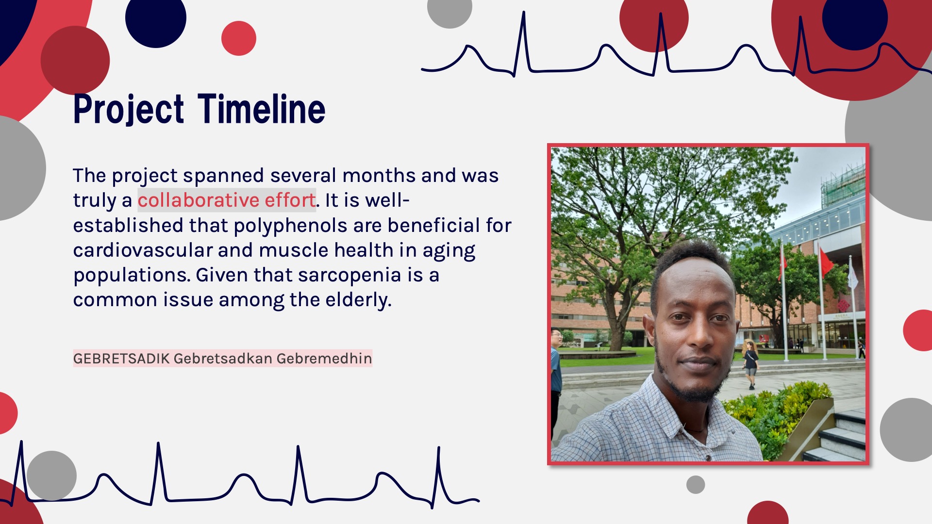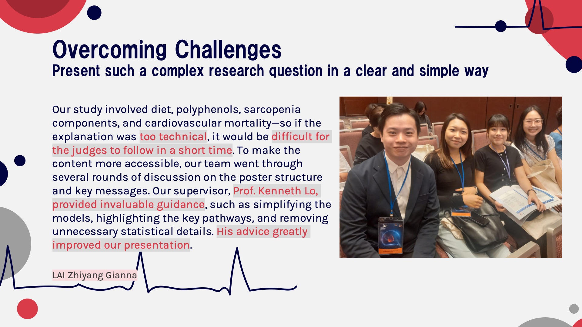 Vicky, Gianna, and Gebretsadkan collaborated on a research project examining the association between polyphenol intake and cardiovascular mortality in older Chinese adults, which they presented at the East Meets West Symposium. They faced challenges with complex data analysis and a tight timeline. Still, they overcame these through teamwork and support from Prof. Kenneth Lo. Gianna led the presentation, Gebretsadkan managed statistical analysis, and Vicky contributed to poster preparation.