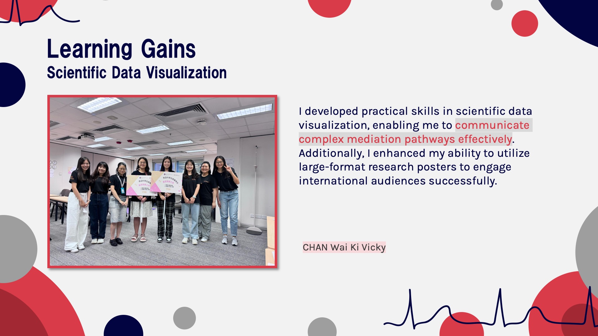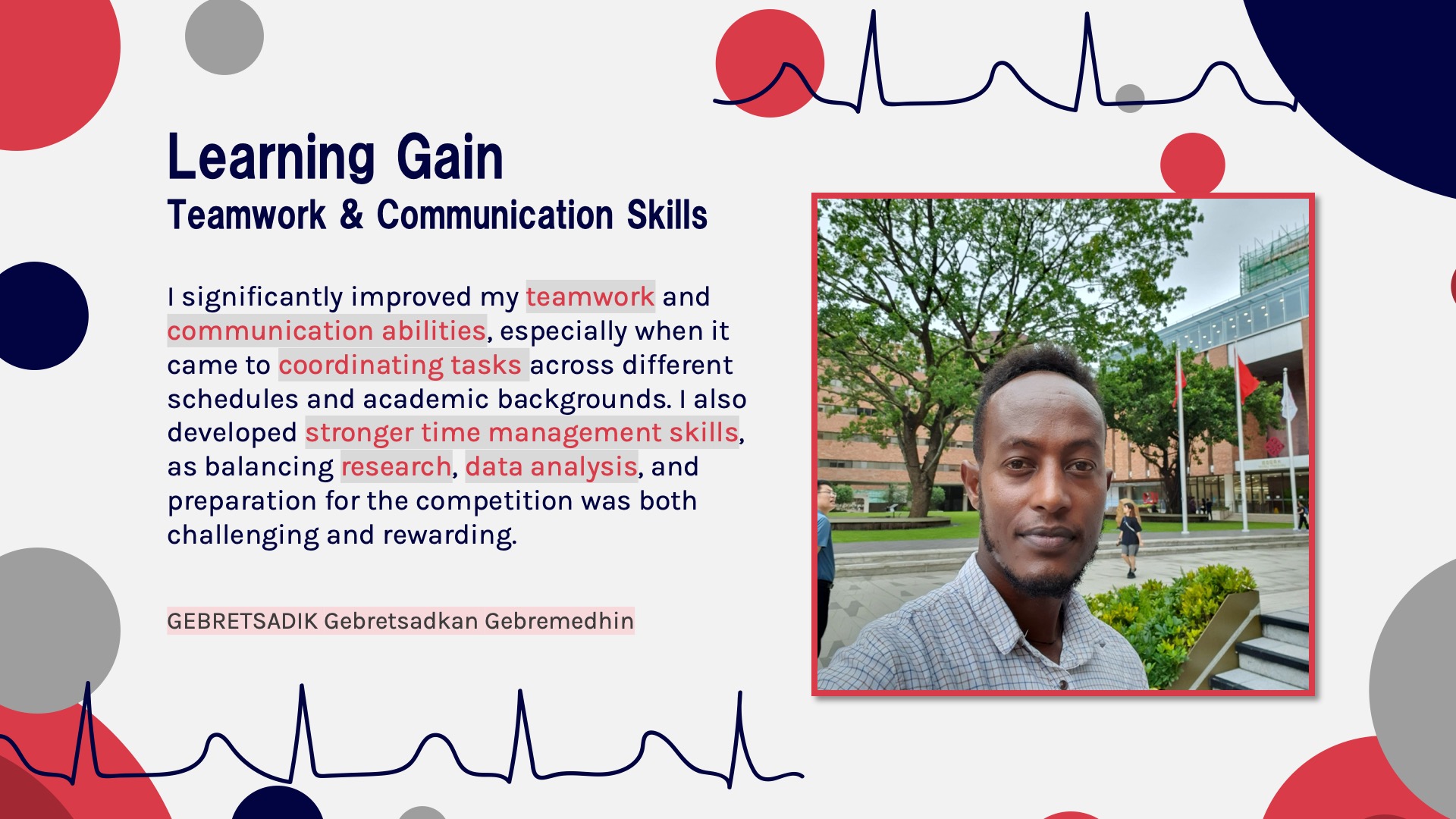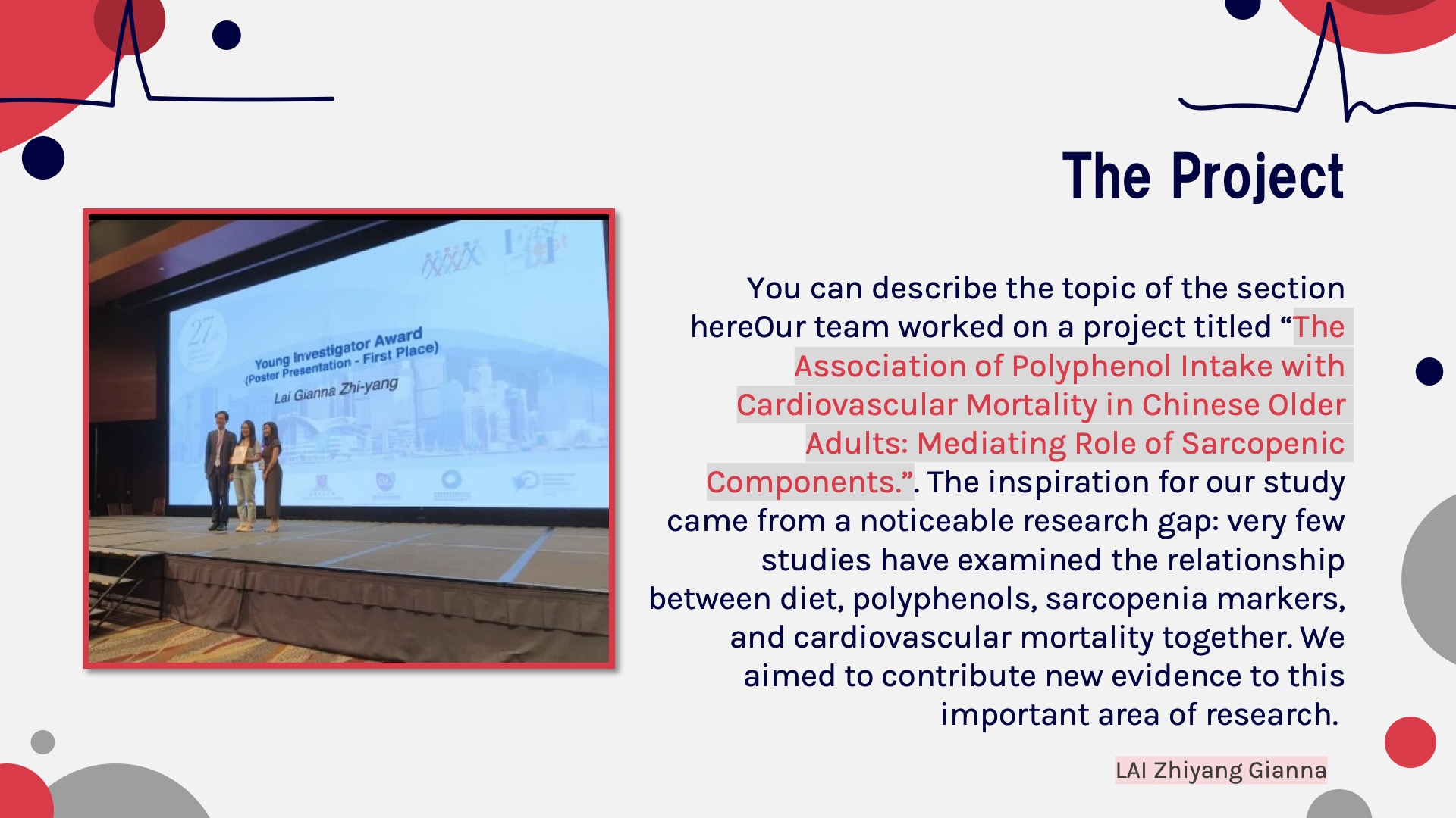 Vicky, Gianna, and Gebretsadkan collaborated on a research project examining the association between polyphenol intake and cardiovascular mortality in older Chinese adults, which they presented at the East Meets West Symposium. They faced challenges with complex data analysis and a tight timeline. Still, they overcame these through teamwork and support from Prof. Kenneth Lo. Gianna led the presentation, Gebretsadkan managed statistical analysis, and Vicky contributed to poster preparation.