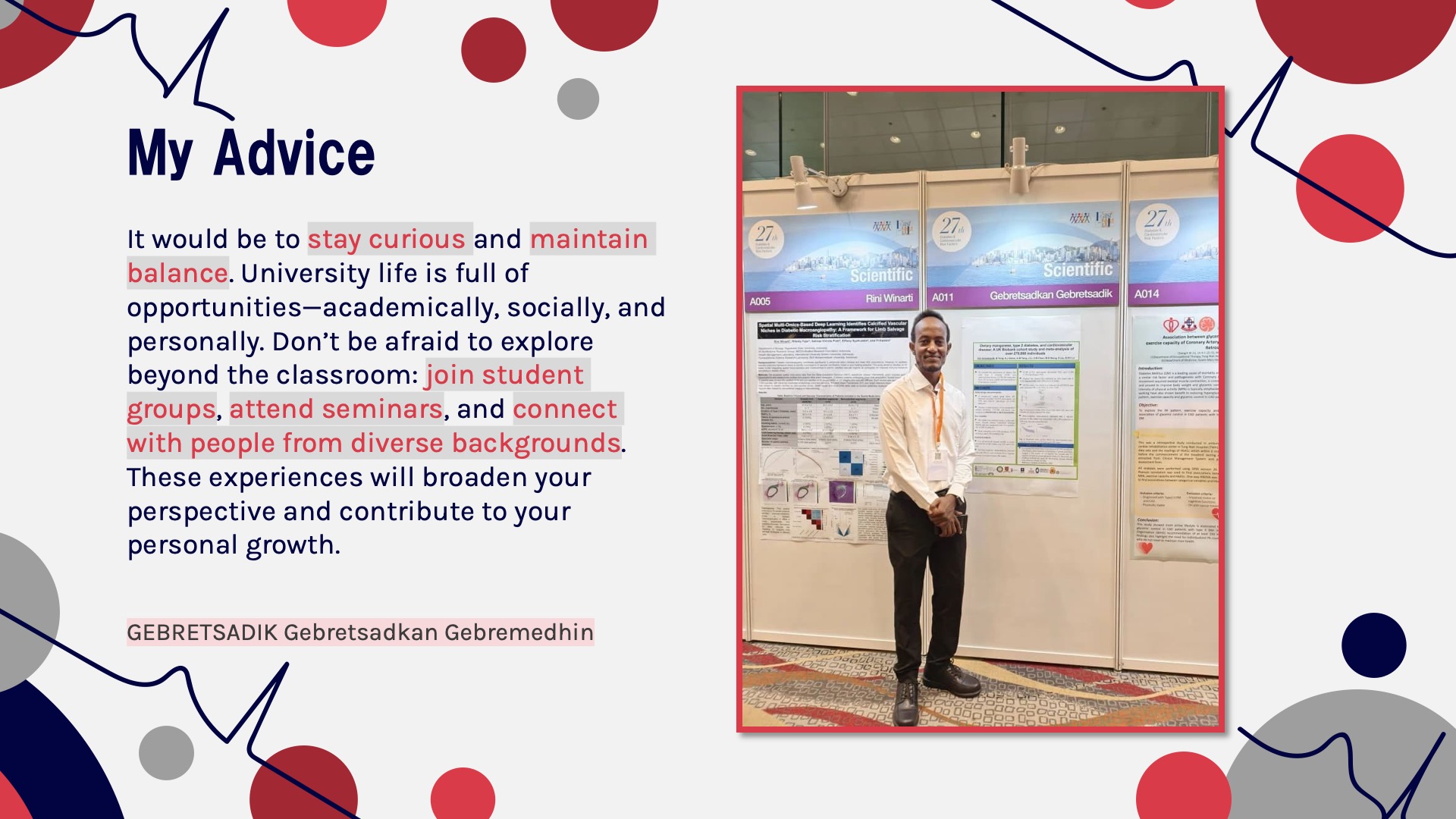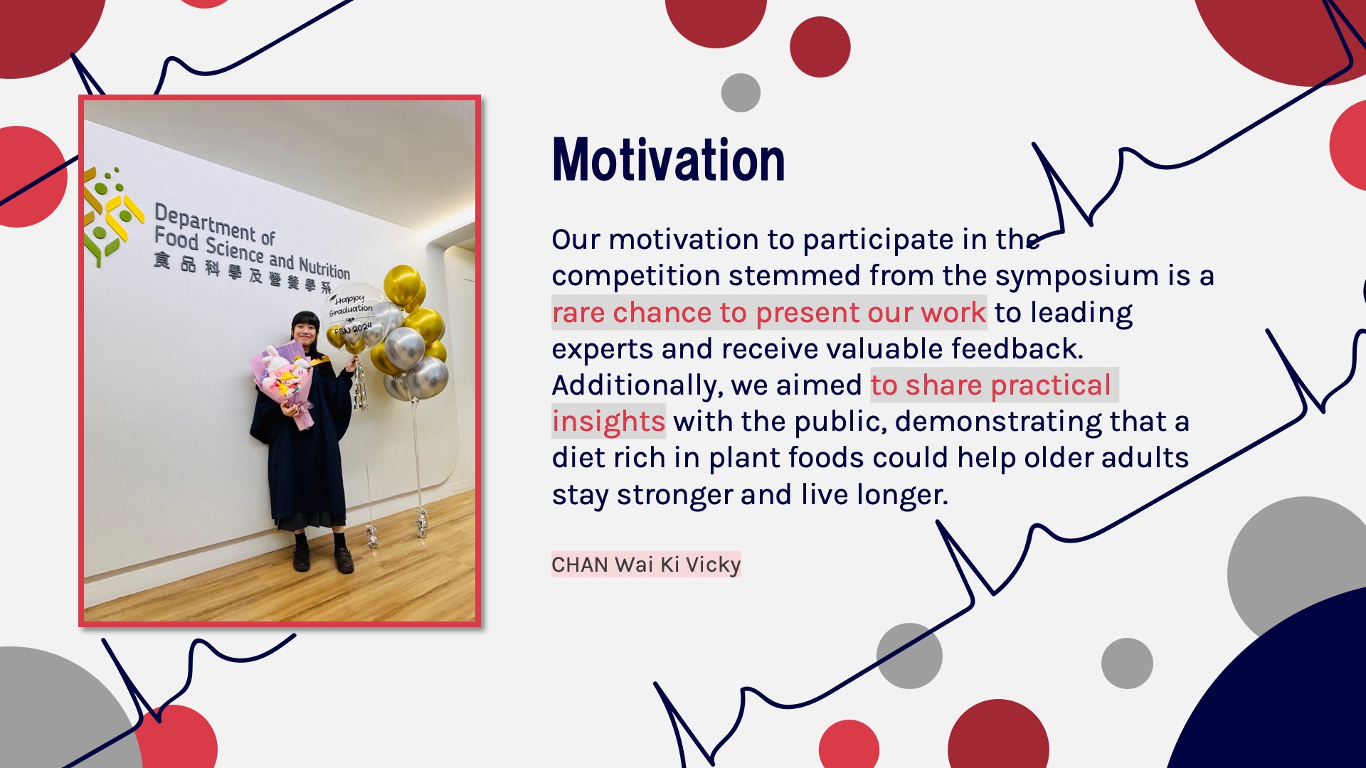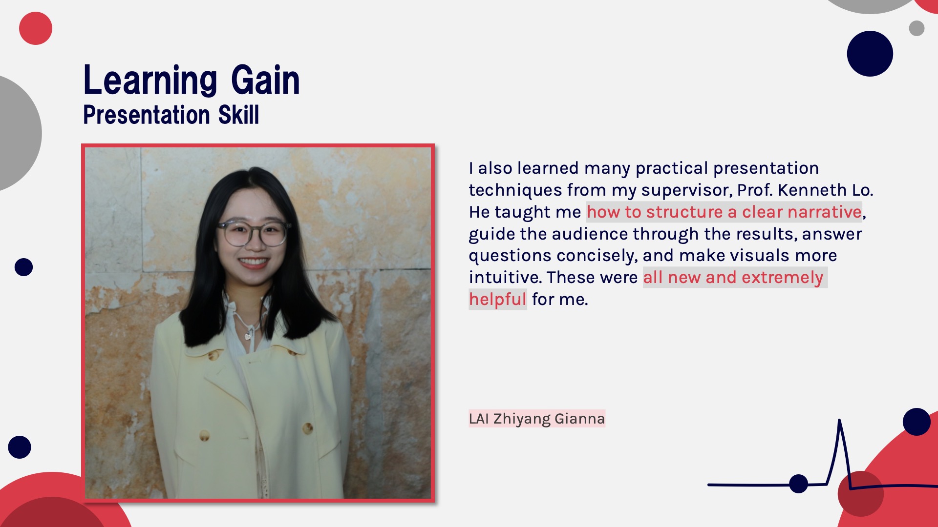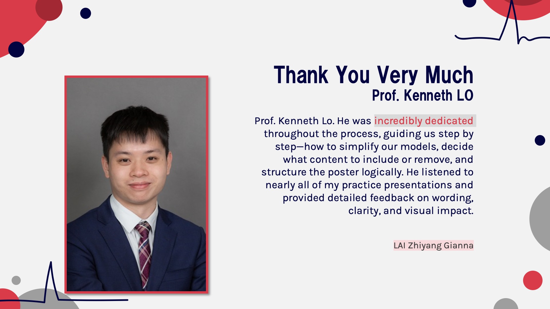Vicky, Gianna, and Gebretsadkan collaborated on a research project examining the association between polyphenol intake and cardiovascular mortality in older Chinese adults, which they presented at the East Meets West Symposium. They faced challenges with complex data analysis and a tight timeline. Still, they overcame these through teamwork and support from Prof. Kenneth Lo. Gianna led the presentation, Gebretsadkan managed statistical analysis, and Vicky contributed to poster preparation.
