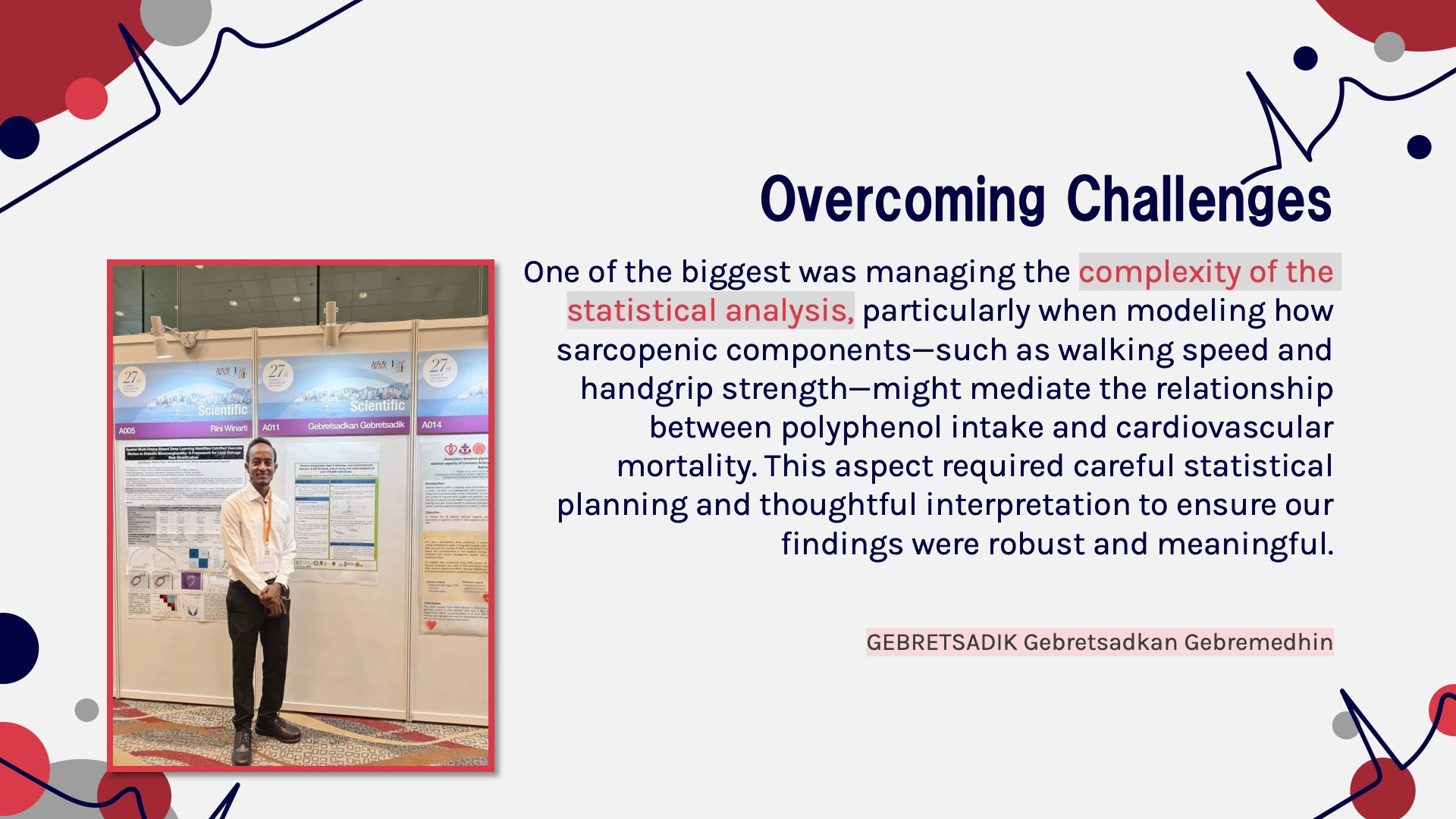 The project involved complex statistical analysis, particularly mediation models to explore how sarcopenic components might mediate the effect of polyphenol intake on cardiovascular mortality. The team used statistical software (like R), conducted sensitivity analyses, and interpreted advanced statistical outputs—demonstrating strong domain knowledge in biostatistics and epidemiological modeling.