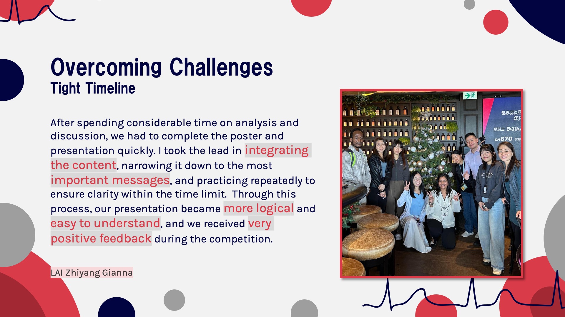 Balancing research, data analysis, and competition preparation under a tight timeline taught the team to organize results quickly, prioritize tasks, and collaborate efficiently. Strong time management skills are vital for lifelong learners to meet deadlines, juggle multiple responsibilities, and maintain productivity.