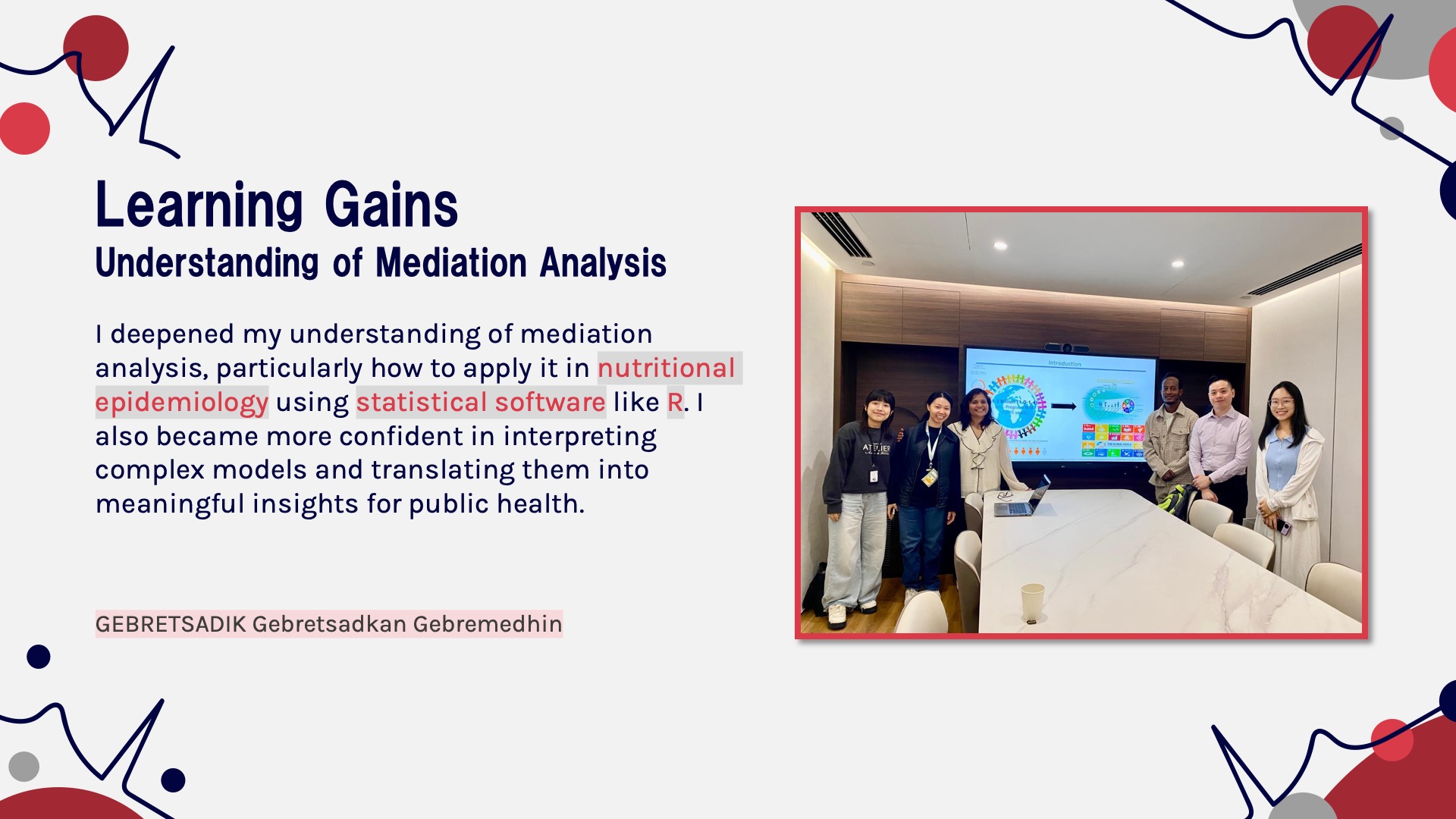 The team excelled at translating complex scientific findings into clear, accessible presentations for both expert and lay audiences. This included preparing research posters, using charts and flow diagrams to illustrate mediation pathways, and summarizing results succinctly. Effective scientific communication and data visualization are essential skills for disseminating research and influencing public health practice.