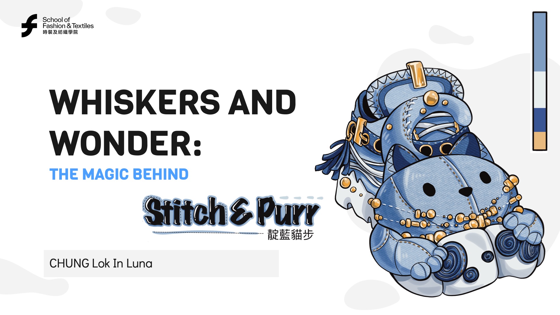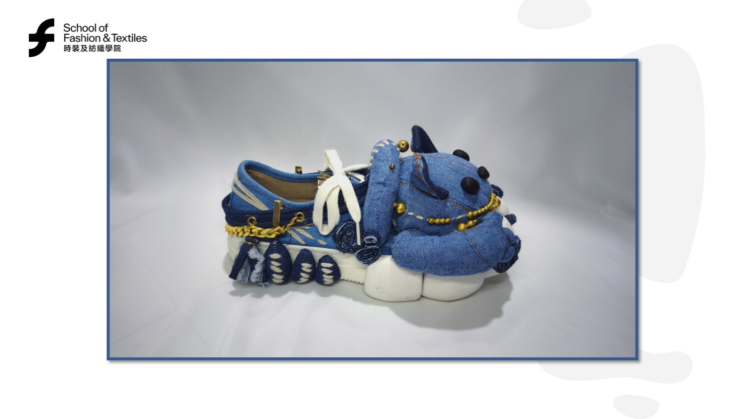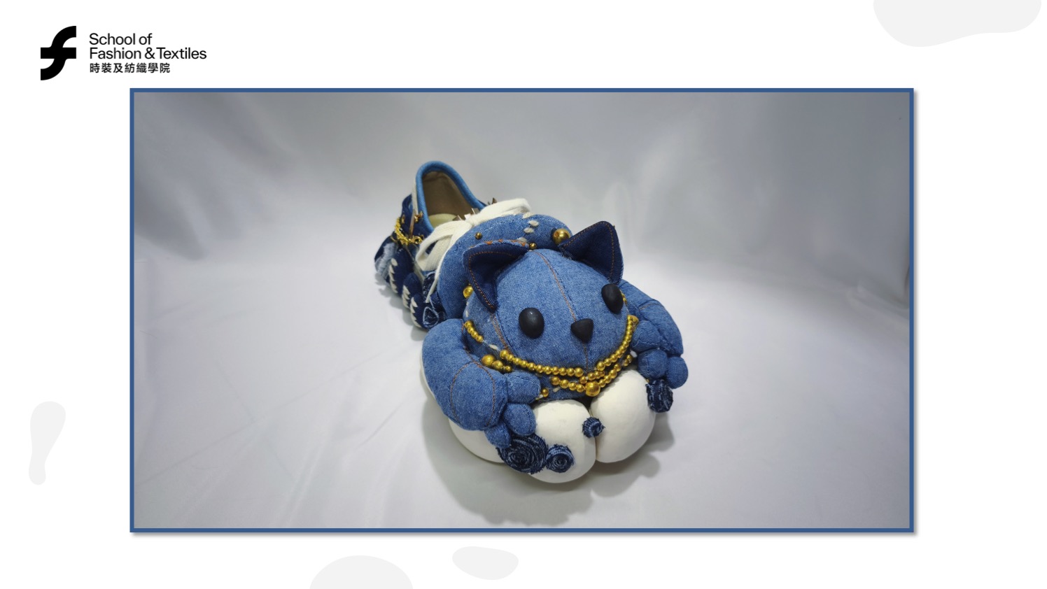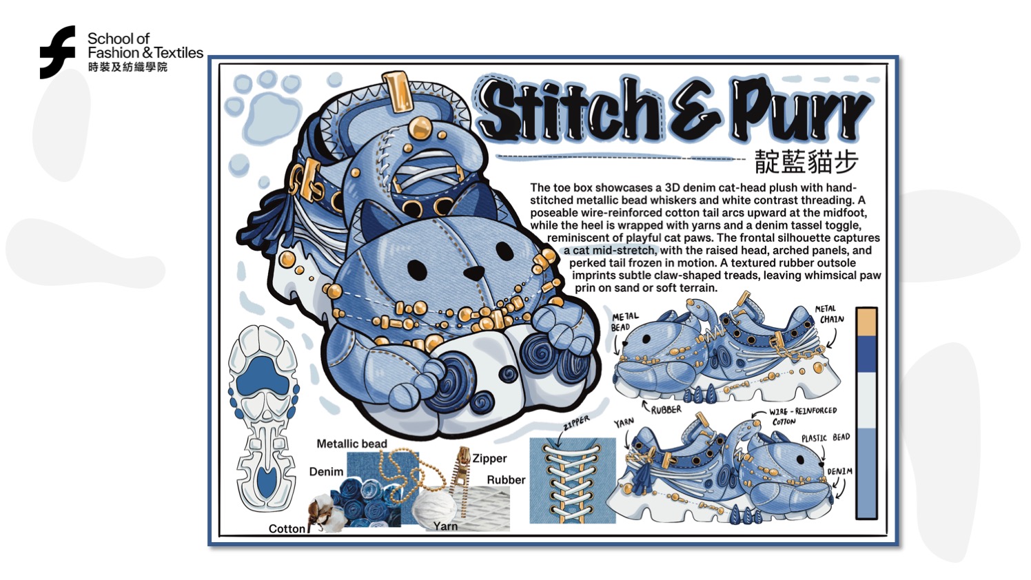 Luna CHUNG’s “Stitch & Purr” project began with a simple wish: to make children’s footwear magical. She designed a sneaker with a 3D denim cat head, stitched whiskers, and a poseable tail, capturing feline curiosity. The outsole’s paw prints add a sense of adventure to every step. Luna had no shoe design background, so she learned through research, prototyping, and support from PolyU’s School of Fashion and Textiles.