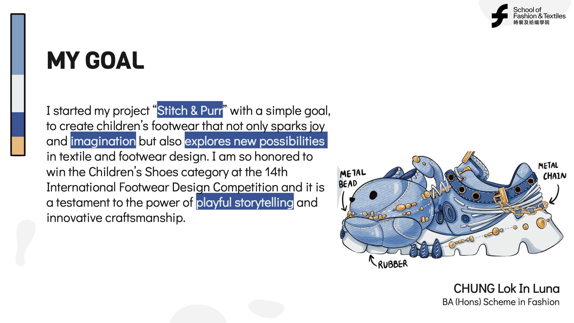 Throughout her project, Luna balanced imaginative storytelling with functional design. She explored new possibilities in textile and footwear design, using creativity to develop unique, joyful products. Lifelong learners continually seek creative solutions and innovative approaches in their work.