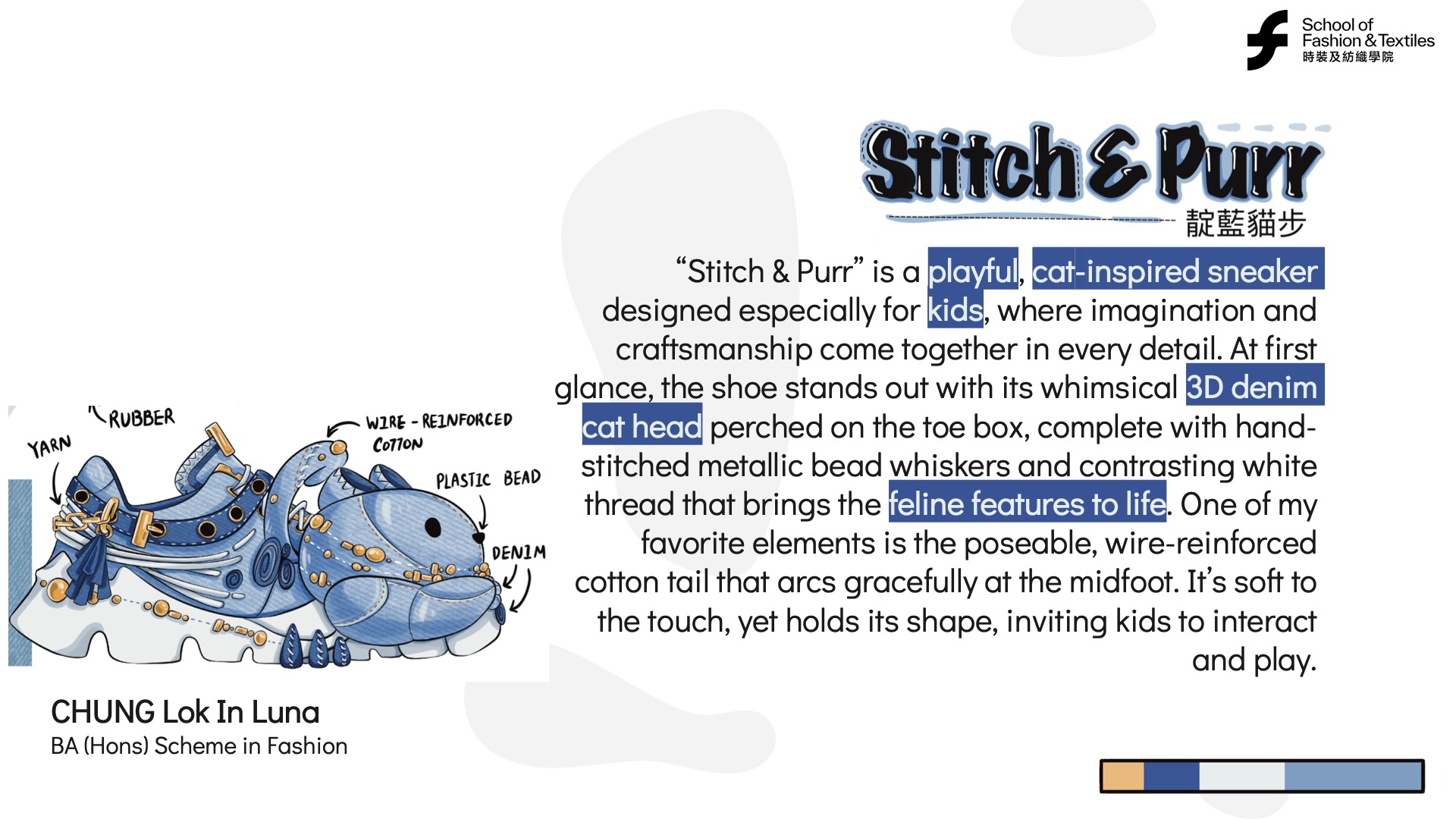 Luna’s cat-inspired sneaker features 3D elements such as a denim cat head, hand-stitched bead whiskers, and a poseable tail. These details showcase her expertise in decorative techniques, adding playful storytelling and tactile interaction to the product, which is especially important in children’s fashion.