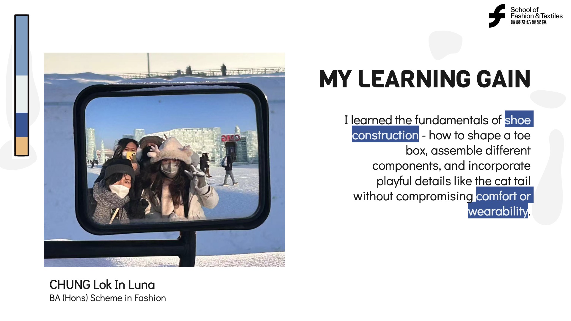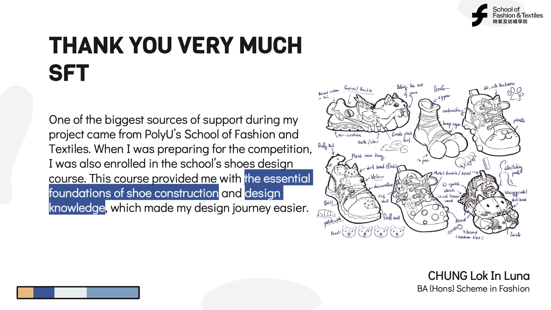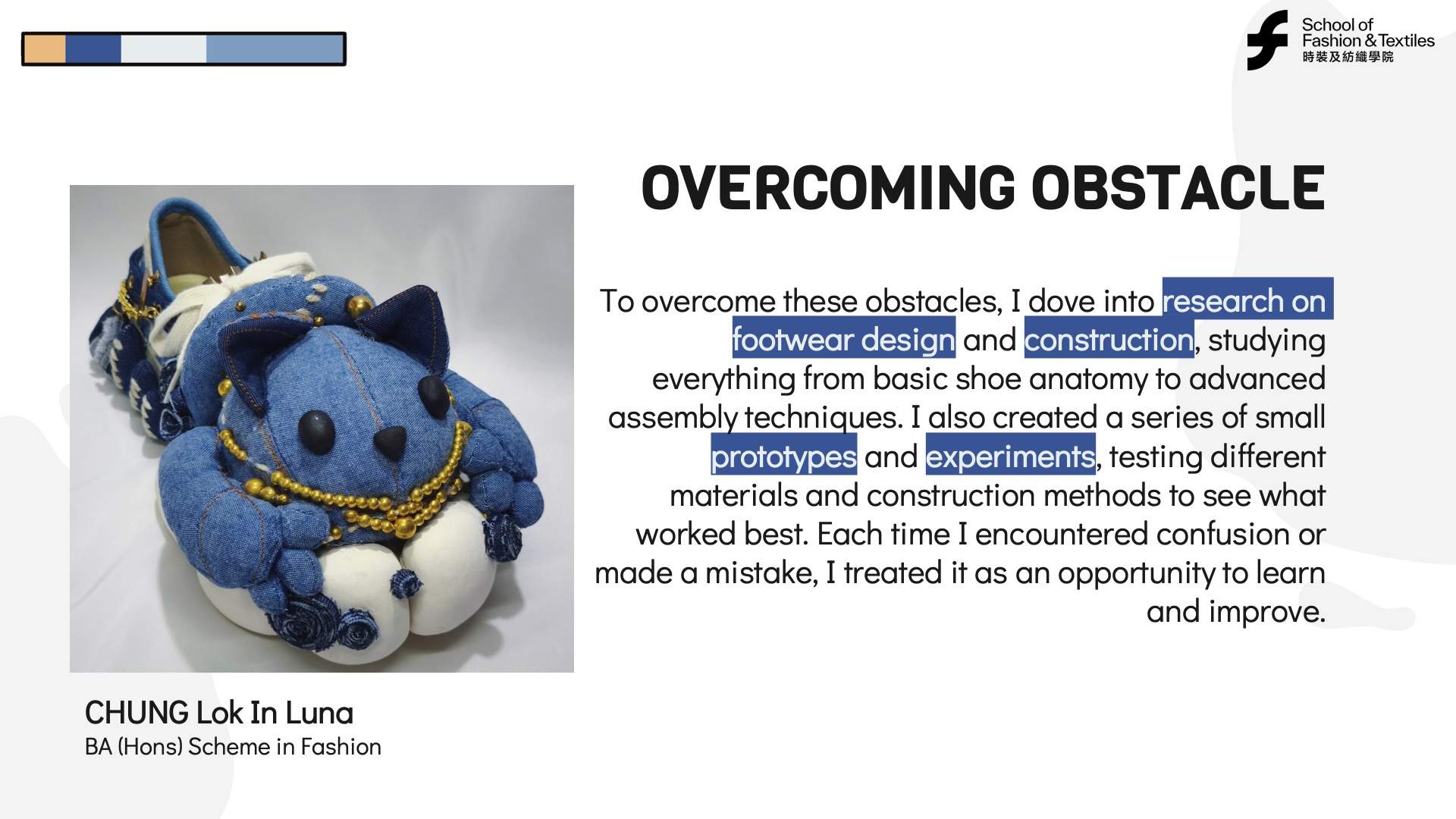Luna benefited from the support of PolyU’s School of Fashion and Textiles and her shoe design course. She recognized the value of learning from others, collaborating, and leveraging available resources. Lifelong learning often involves engaging with mentors, peers, and communities to enhance personal and professional growth.