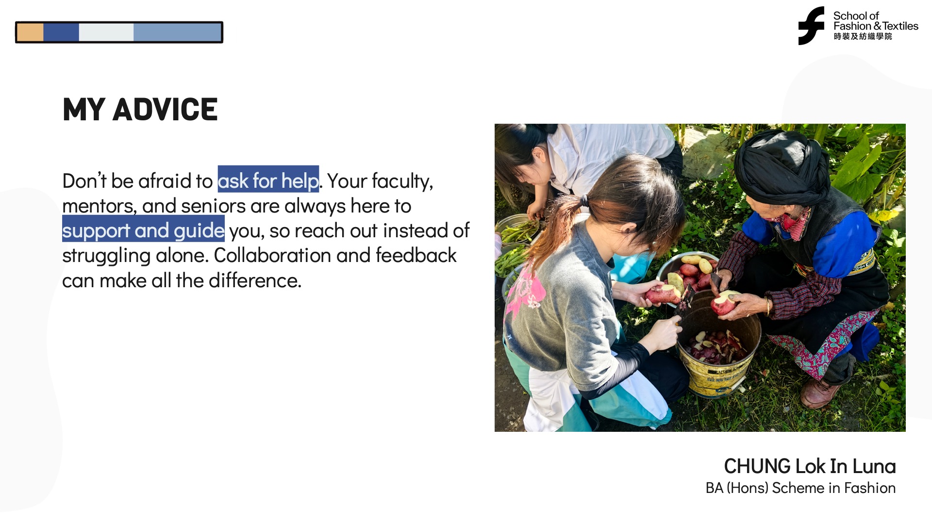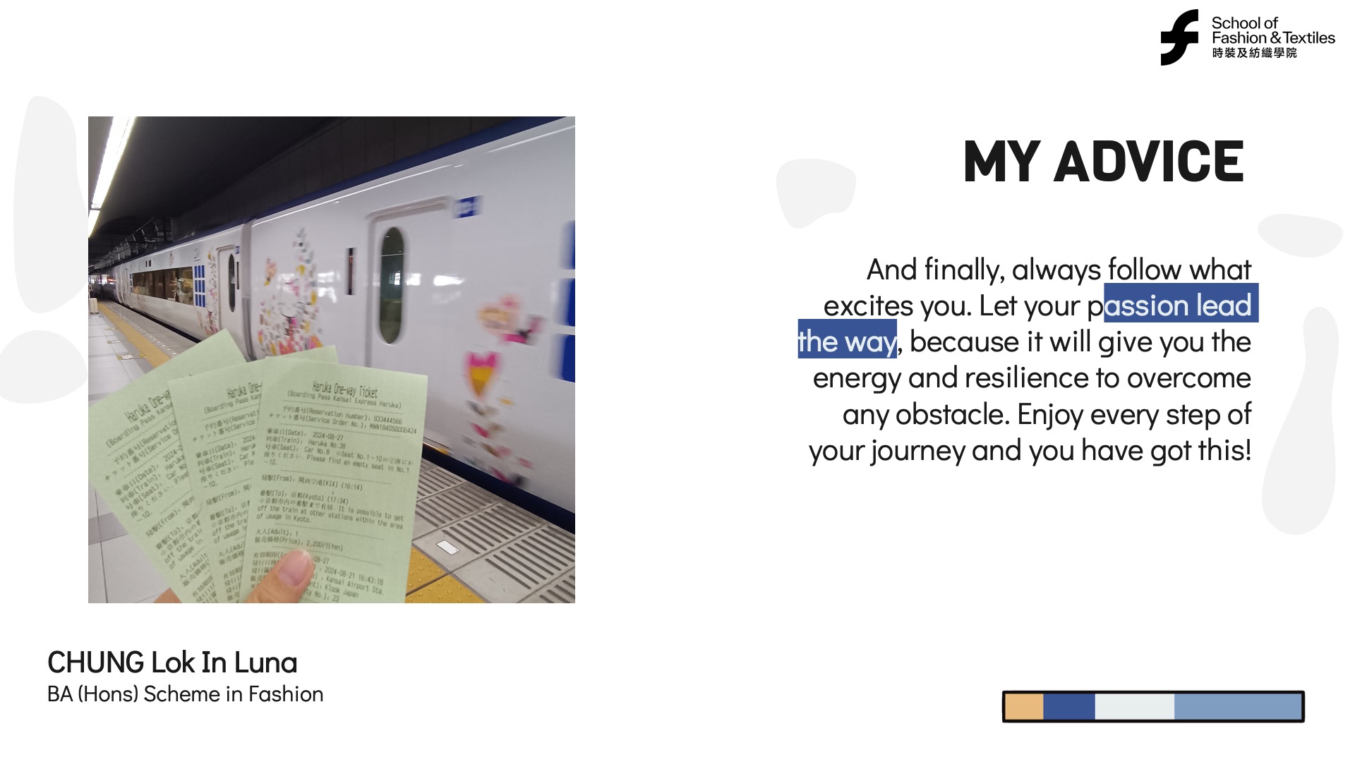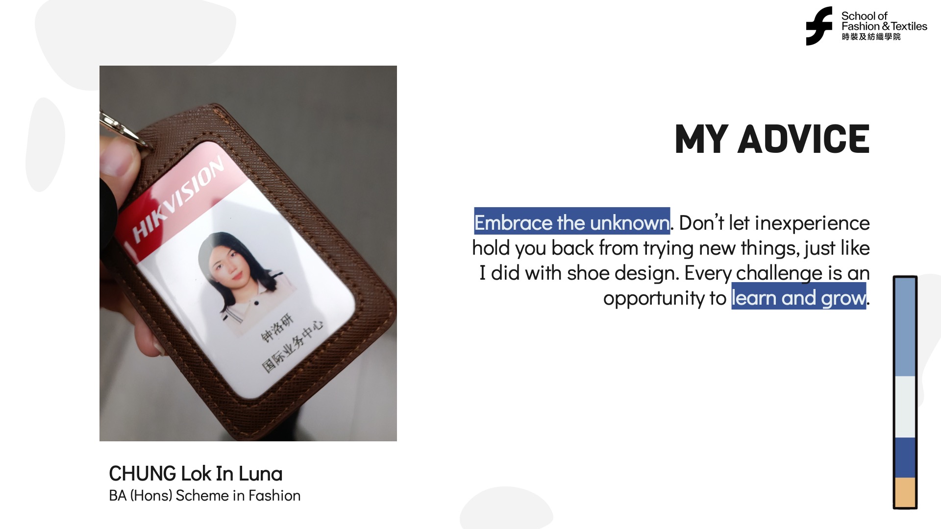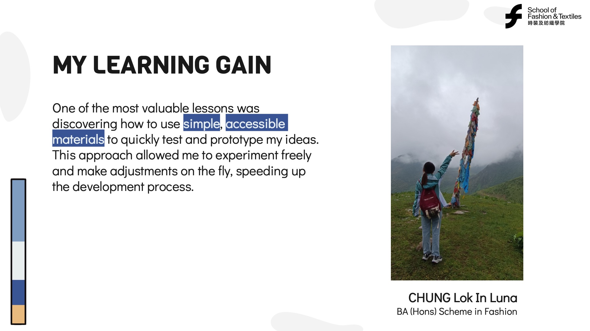 Luna benefited from the support of PolyU’s School of Fashion and Textiles and her shoe design course. She recognized the value of learning from others, collaborating, and leveraging available resources. Lifelong learning often involves engaging with mentors, peers, and communities to enhance personal and professional growth.